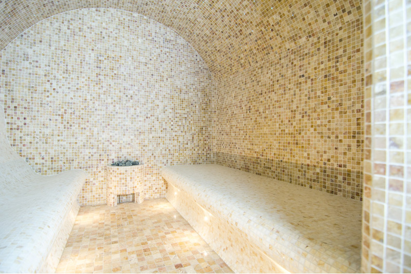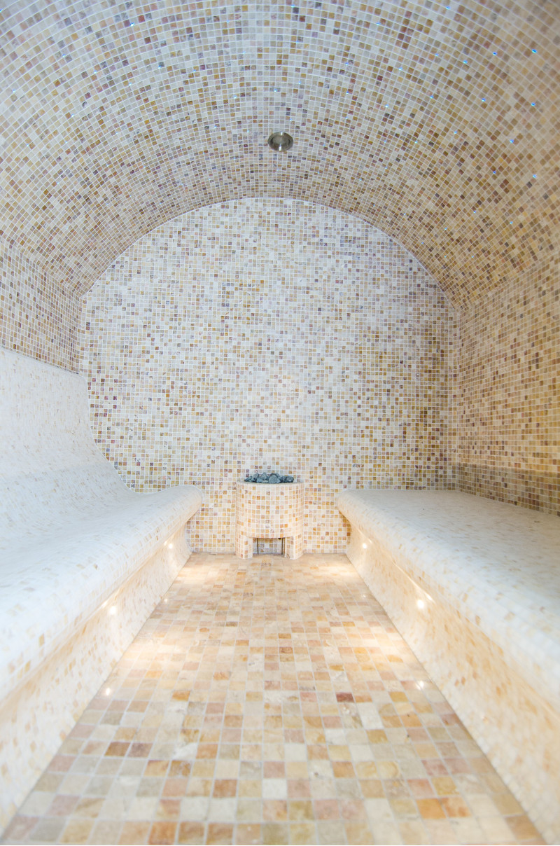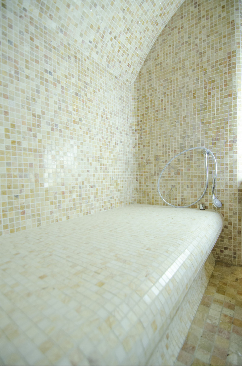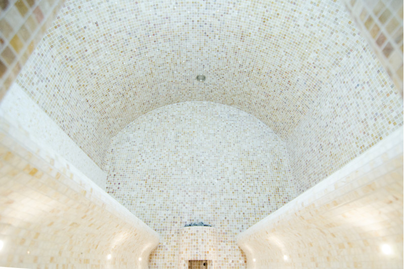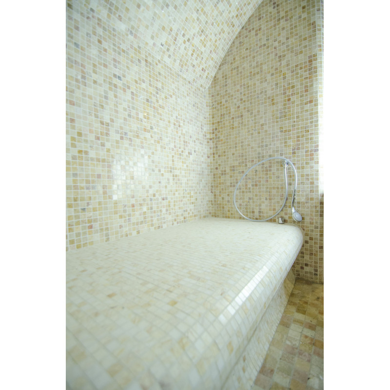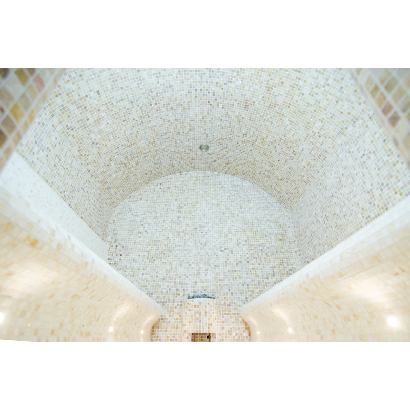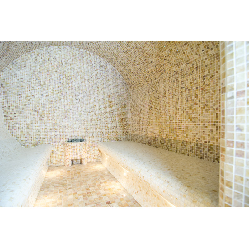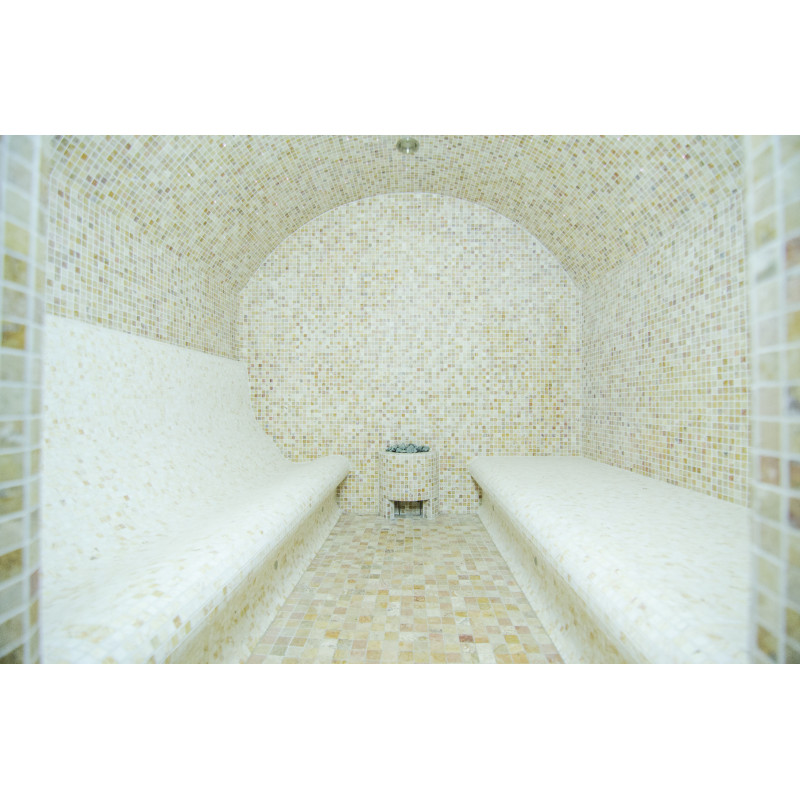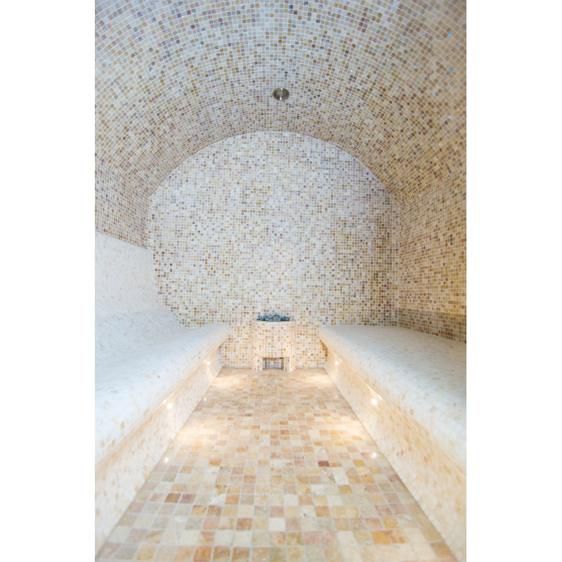 Finitura: l'intera sauna e le panche sono decorate con tessere di mosaico.