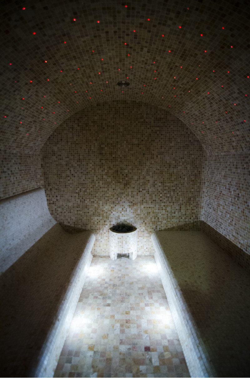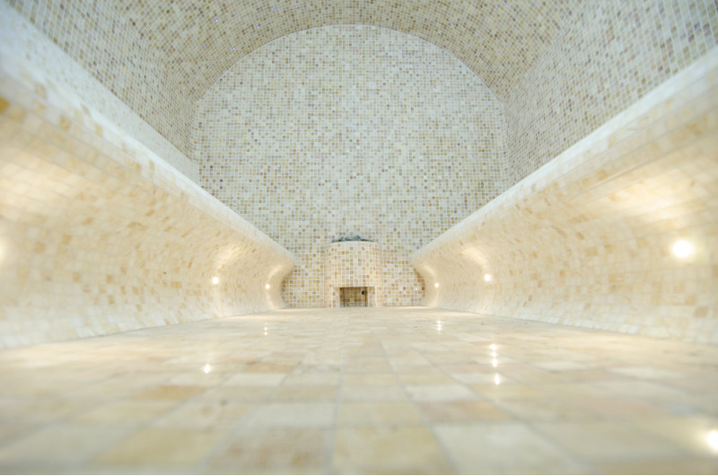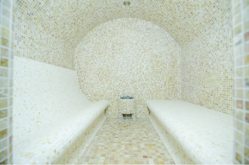 Su richiesta del cliente, i lettini per sauna sono progettati in due modi: puoi goderti la sauna sia sdraiati che seduti. Letti, pareti e soffitti del bagno turco sono realizzati individualmente in speciale polistirene estruso. Le panche per sedersi si trovano sul lato destro e sul lato sinistro sono panche per godersi la sauna stando sdraiati. I soffitti ad arco impediscono alla condensa del vapore di gocciolare da essi.