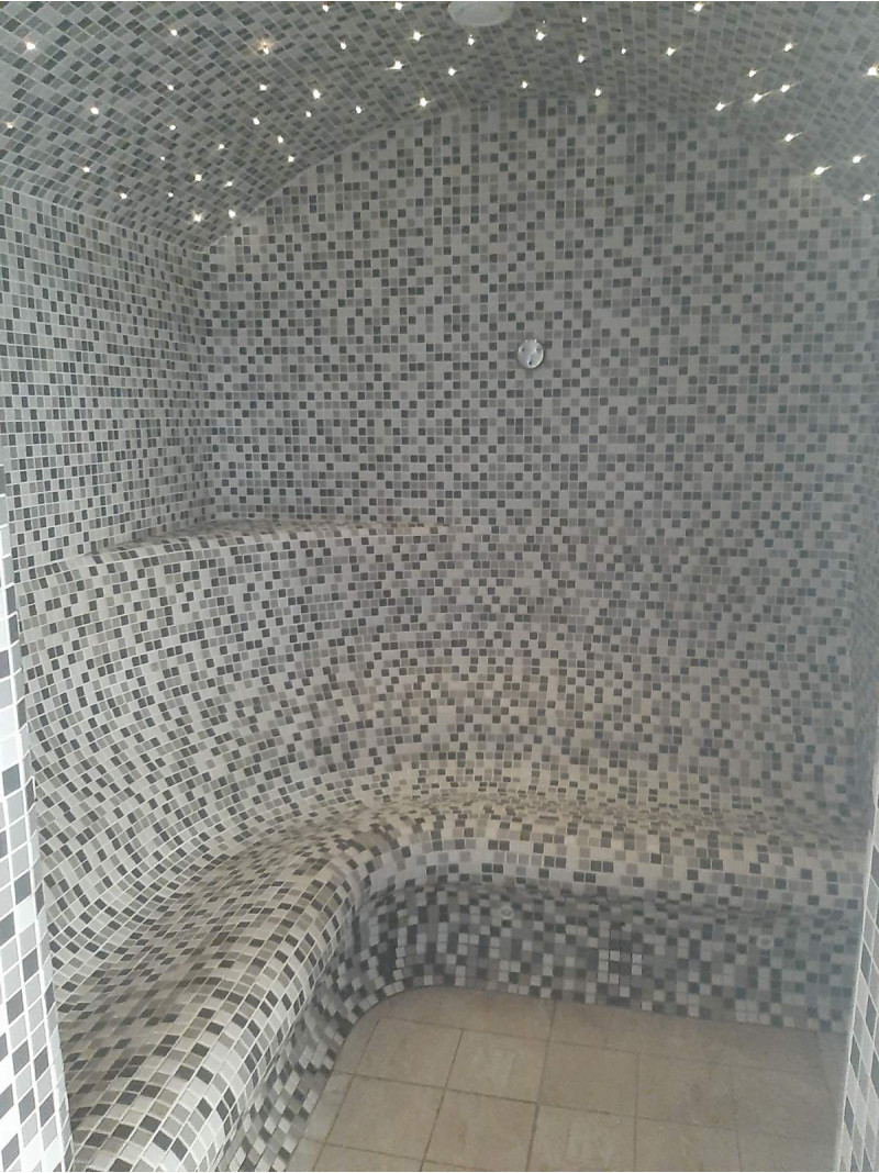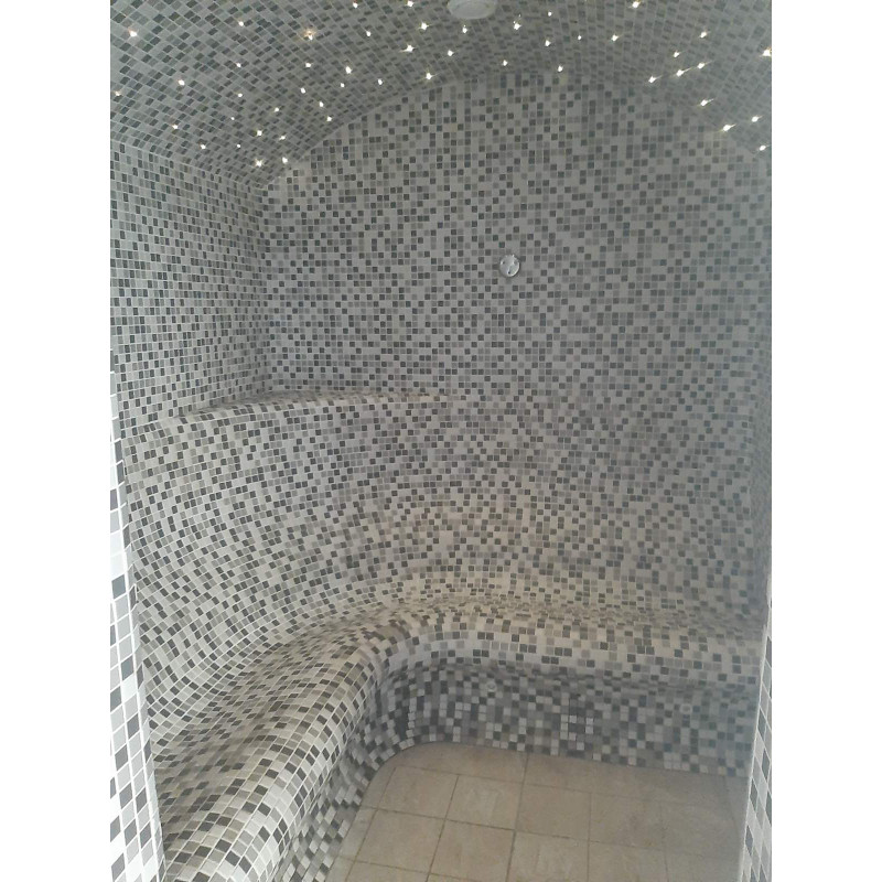 - Sauna a vapore: materiali utilizzati in grado di resistere a temperature estremamente elevate e umidità molto elevata. Il soffitto è ad arco in modo che la condensa del vapore non goccioli sulle persone che si godono la sauna. Per il decoro sono state scelte delle piastrelle e per il soffitto l'illuminazione in fibra ottica, creando un effetto cielo stellato. Le panche hanno una forma particolarmente confortevole.
