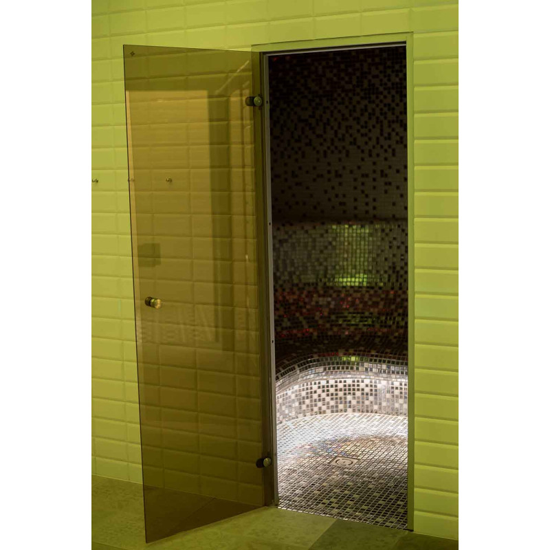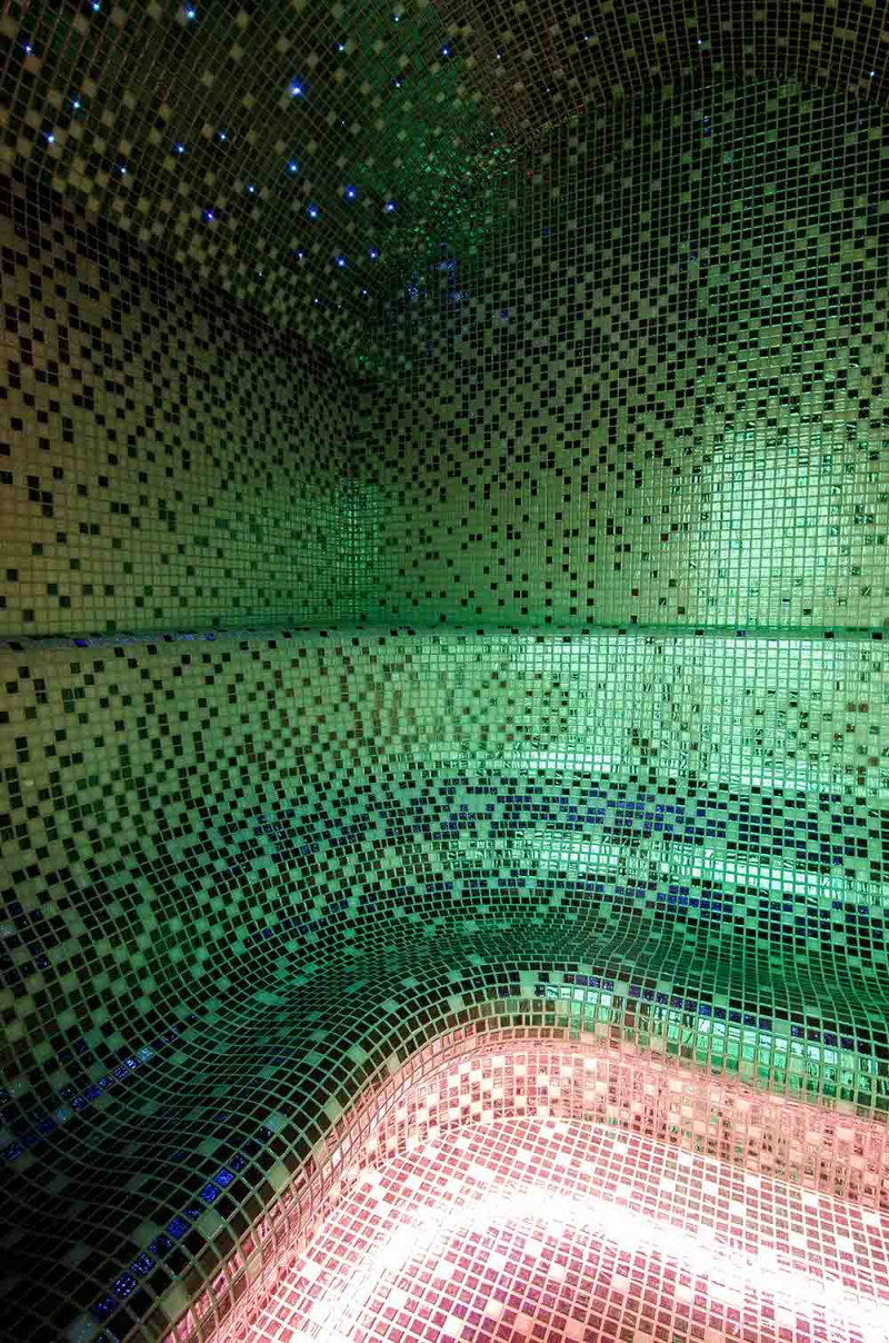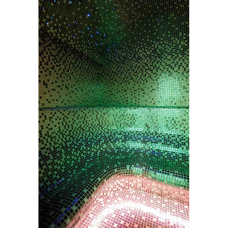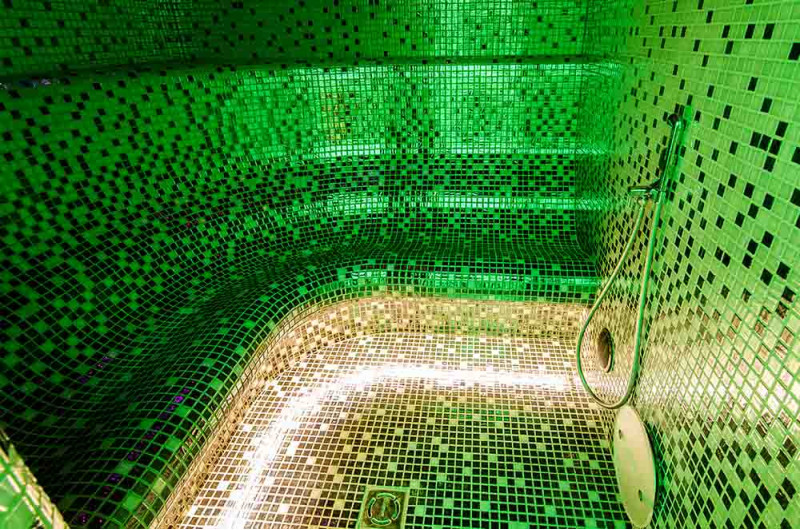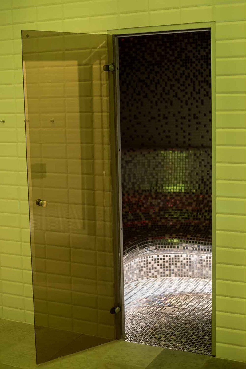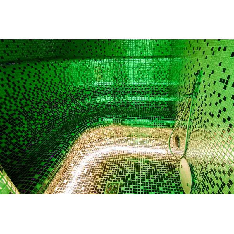 Le superfici interne del bagno turco sono formate secondo un progetto individuale da polistirene espanso, utilizzando stirene EPS a taglio continuo. Tessere di mosaico incollate, adattate alla curvatura e riempite con impermeabilizzante Schonox grigio. Il pavimento della stanza è riscaldato. Ante - telaio in alluminio, vetro temperato fumé. Attrezzatura per bagno turco: