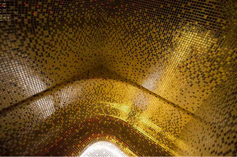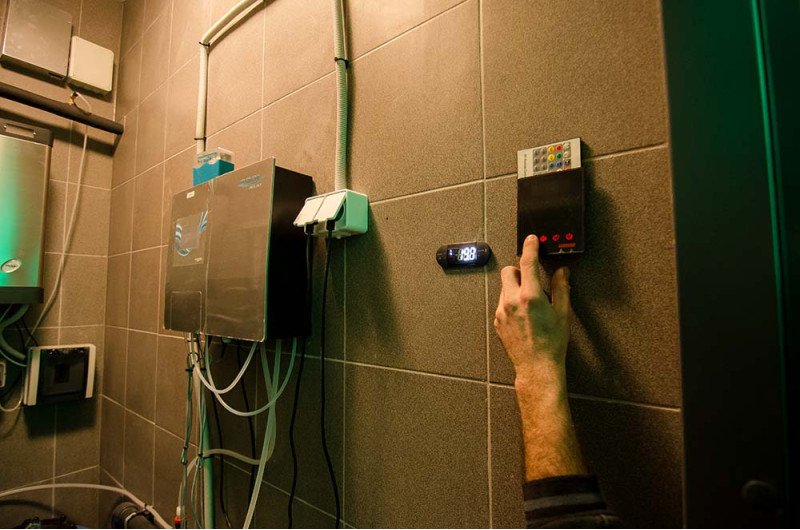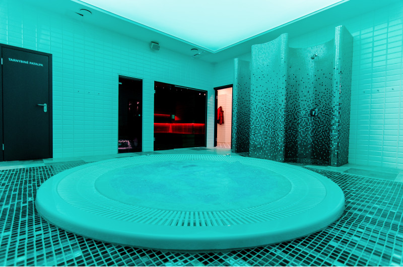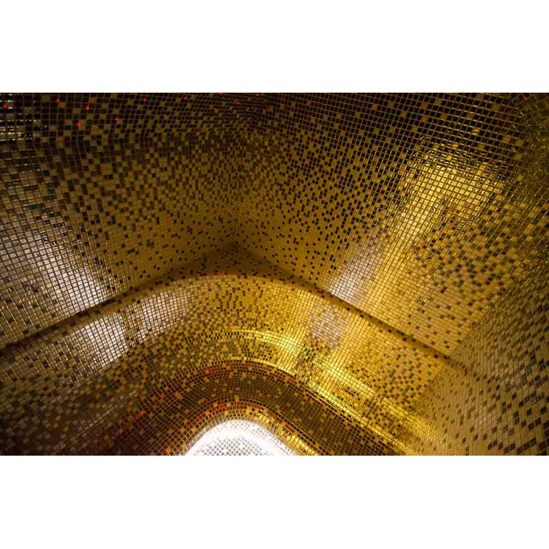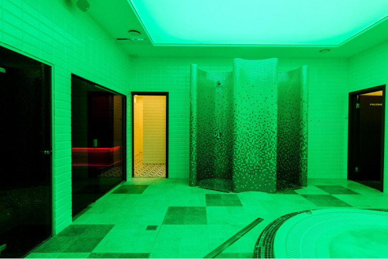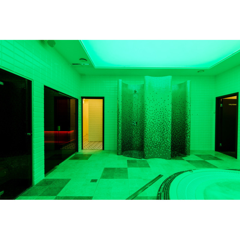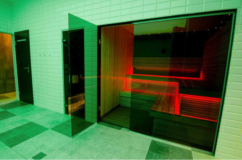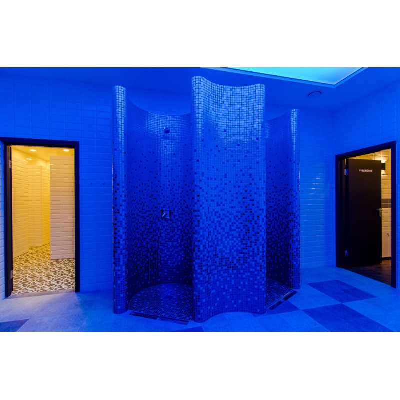 Le superfici interne del bagno turco sono formate secondo un progetto individuale da polistirene espanso, utilizzando stirene EPS a taglio continuo. Tessere di mosaico incollate, adattate alla curvatura e riempite con impermeabilizzante Schonox grigio. Il pavimento della stanza è riscaldato. Ante - telaio in alluminio, vetro temperato fumé. Attrezzatura per bagno turco: