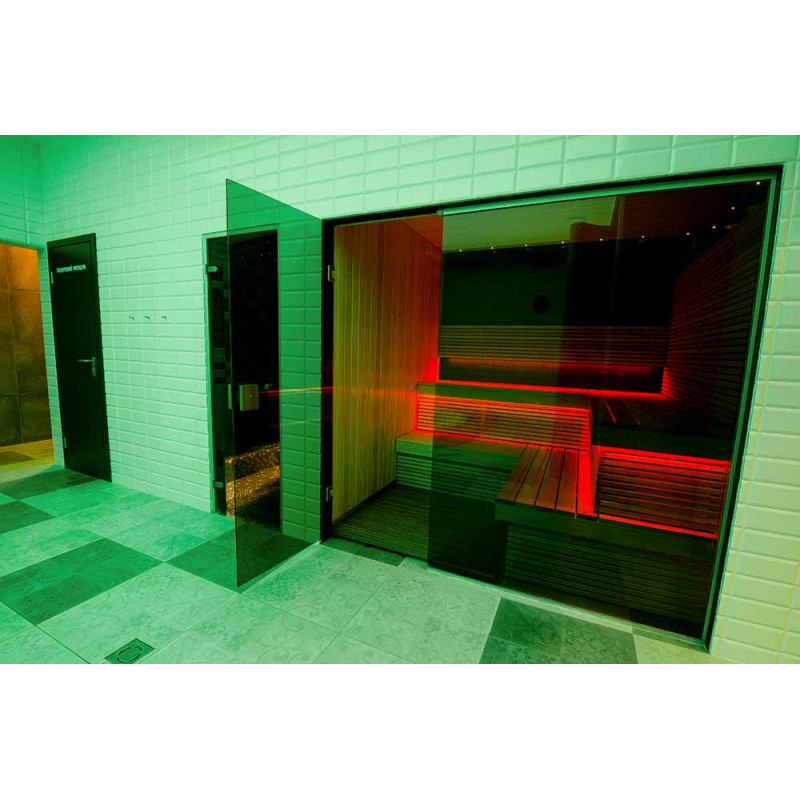 - creando uno stile senza soluzione di continuità, la vetrina di vetro installata nella sauna espande lo spazio e crea l'impressione di leggerezza, dona alla stanza luce e modernità. Vetro vetrina - fumé, temperato, telaio in alluminio,