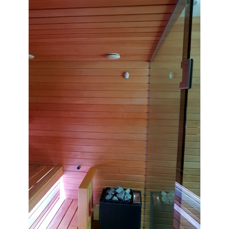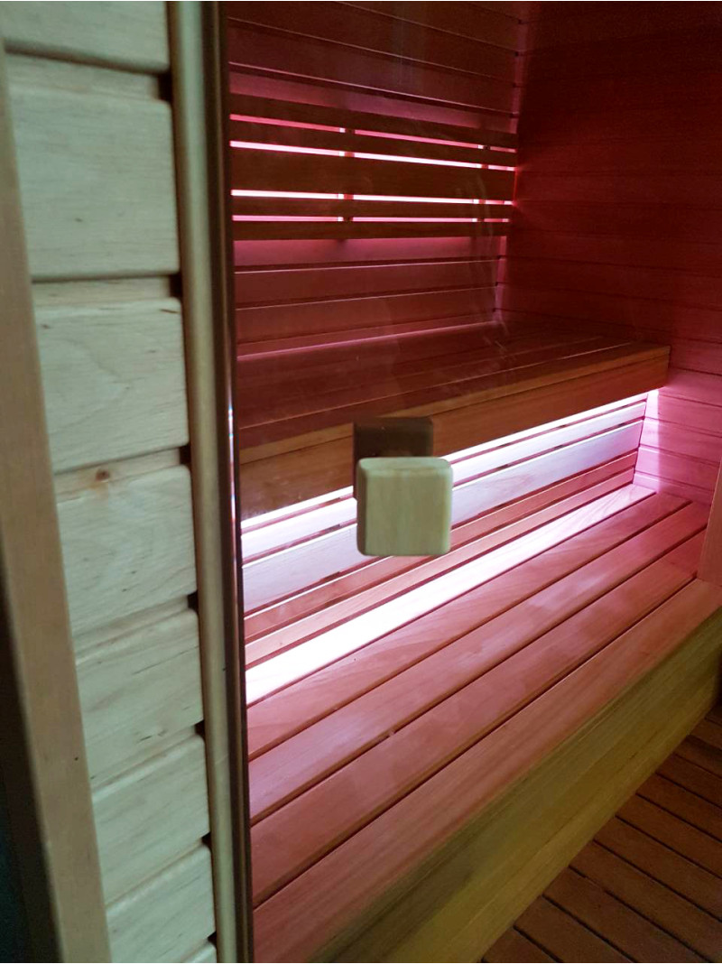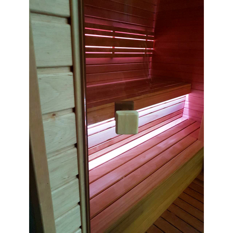 L'illuminazione della sauna è un dettaglio molto importante che dona un effetto semirilassante nella sauna. Sotto le panche e gli schienali, c'è l'illuminazione a LED RGB colorata, che puoi cambiare colore ogni volta che vuoi. La sauna è inoltre dotata di un sistema di illuminazione a fibre ottiche bianco "Luna".