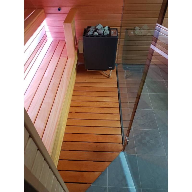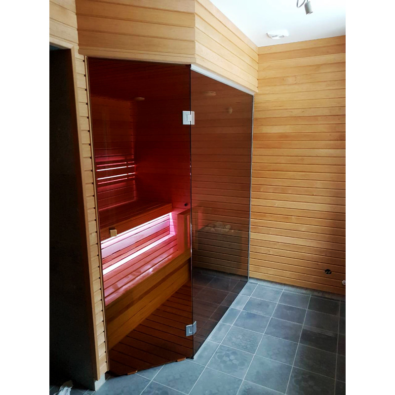 Invece delle tradizionali porte e pareti, questa sauna combinata ha una vetrina dall'aspetto moderno in vetro temperato colorato. Una tale vetrina è moderna e fornisce un senso di spazio.