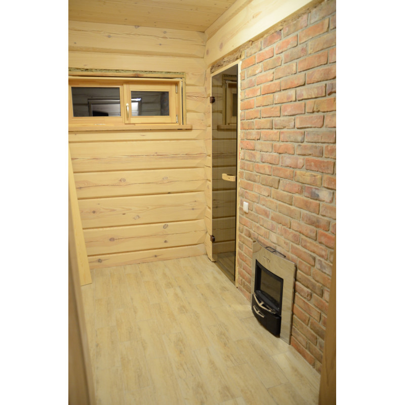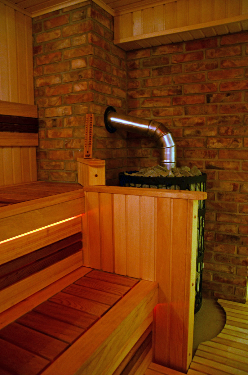 Le panche sono realizzate in legno di abachi africano e cedro canadese. Questo legno riscalda meno di tutti, quindi è bello sedersi su tali panche. Le panche sono spaziose ed è comodo prendere il sole in sauna, sia seduti che sdraiati.