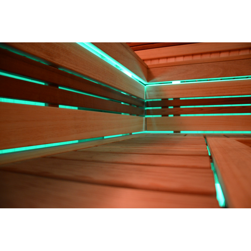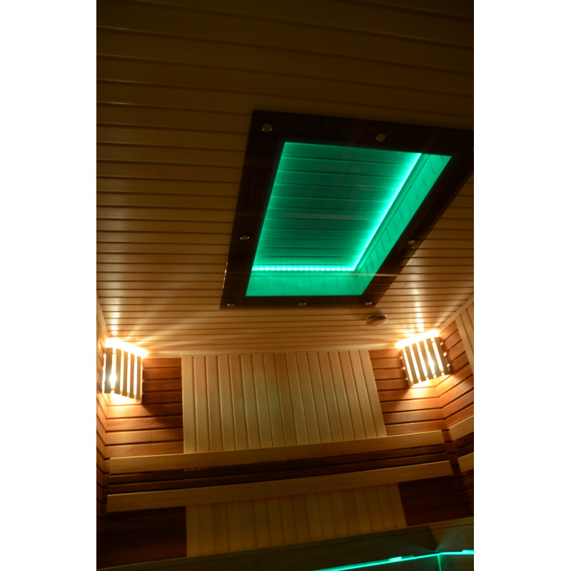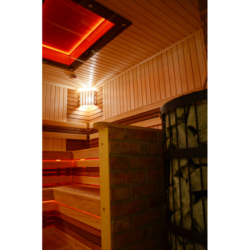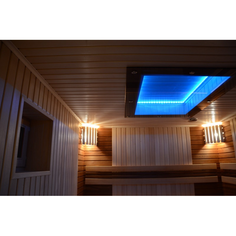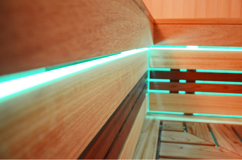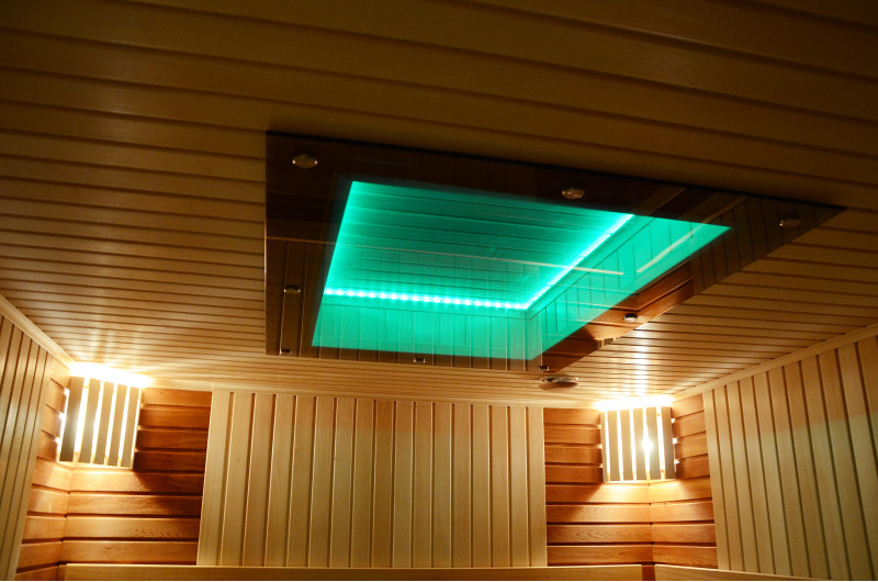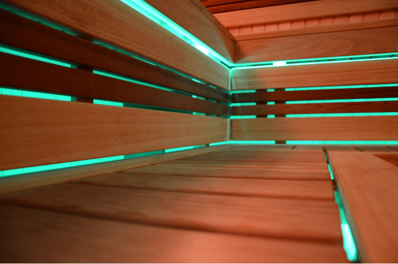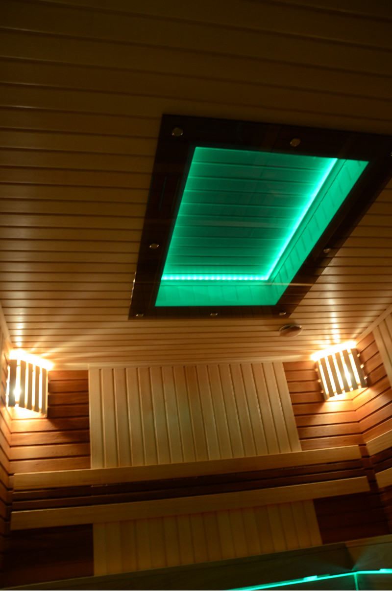 Sul soffitto e sotto le panche - illuminazione a colori LED RGB, i cui colori possono essere modificati per creare la giusta atmosfera e atmosfera. Illuminazione da parete - Lampade a LED bianco caldo con coperture in legno. Le coperture aiutano ad attenuare la luce, aggiungono più intimità alla sauna. Inoltre protegge gli apparecchi da acqua, vapore e calore.