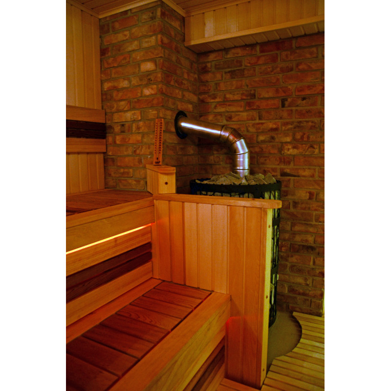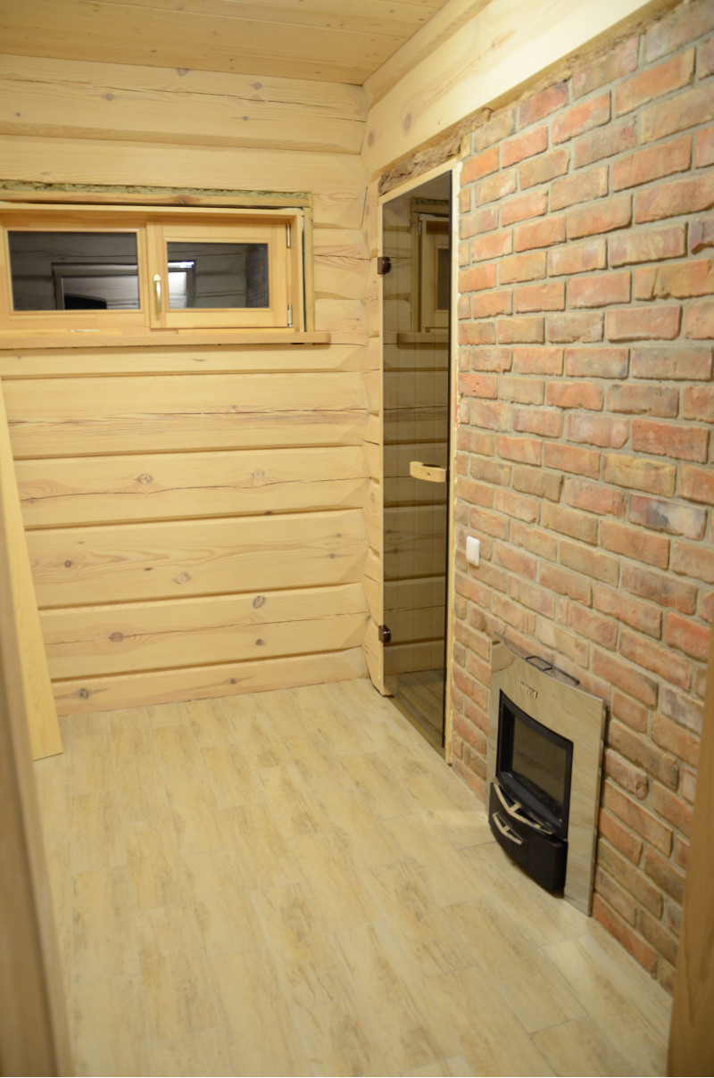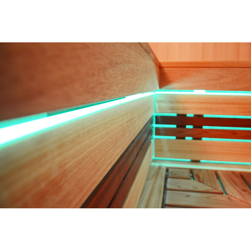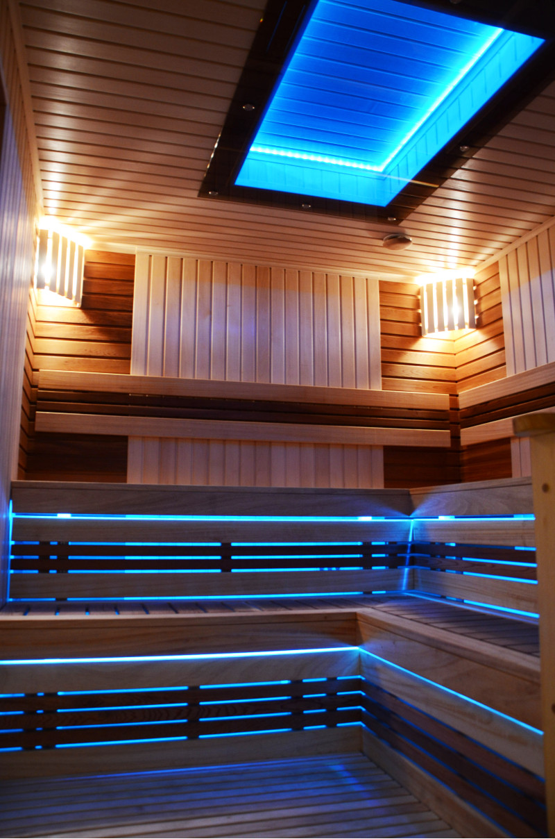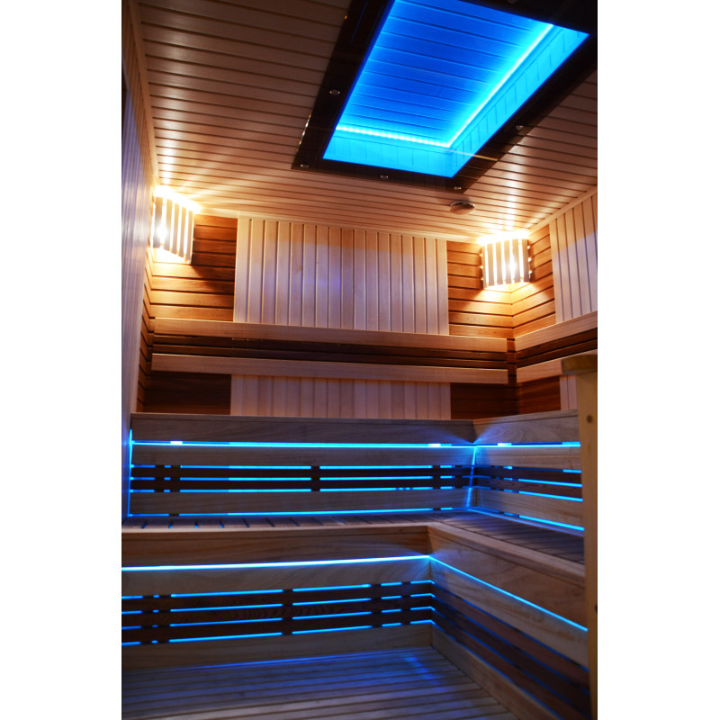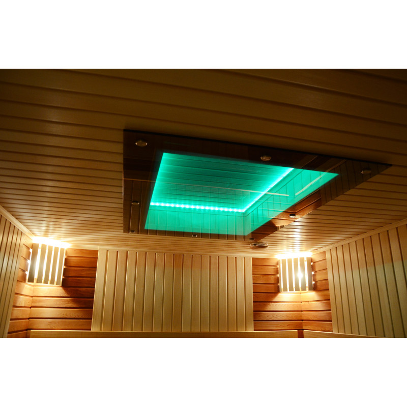 Sul soffitto e sotto le panche - illuminazione a colori LED RGB, i cui colori possono essere modificati per creare la giusta atmosfera e atmosfera. Illuminazione da parete - Lampade a LED bianco caldo con coperture in legno. Le coperture aiutano ad attenuare la luce, aggiungono più intimità alla sauna. Inoltre protegge gli apparecchi da acqua, vapore e calore.