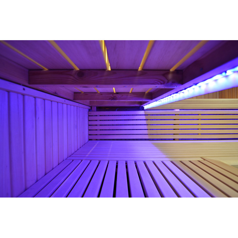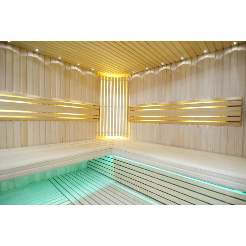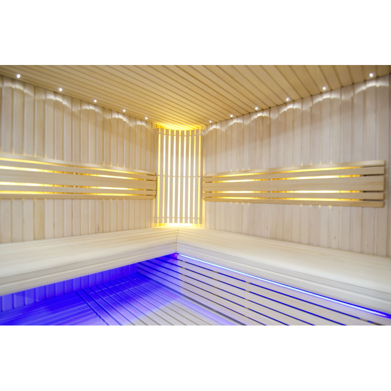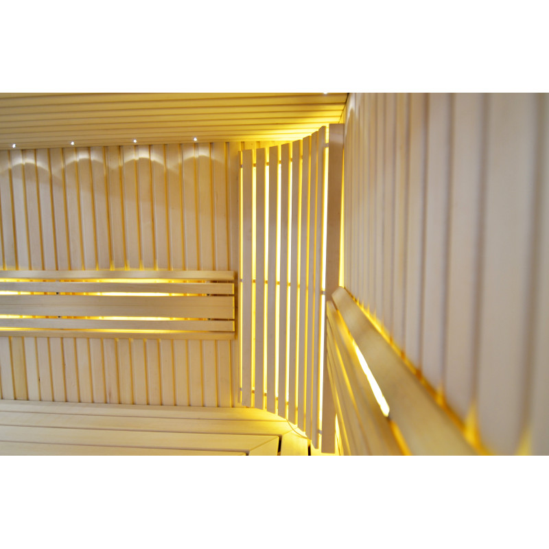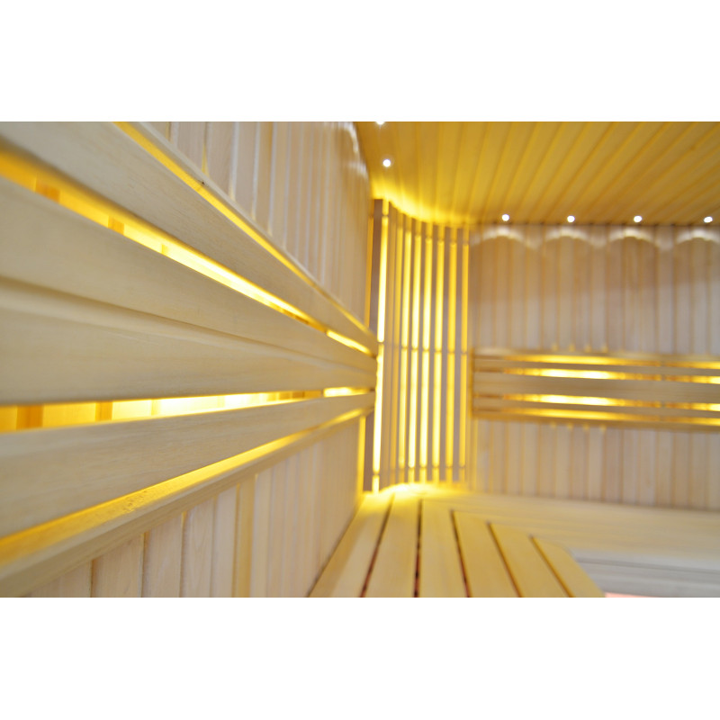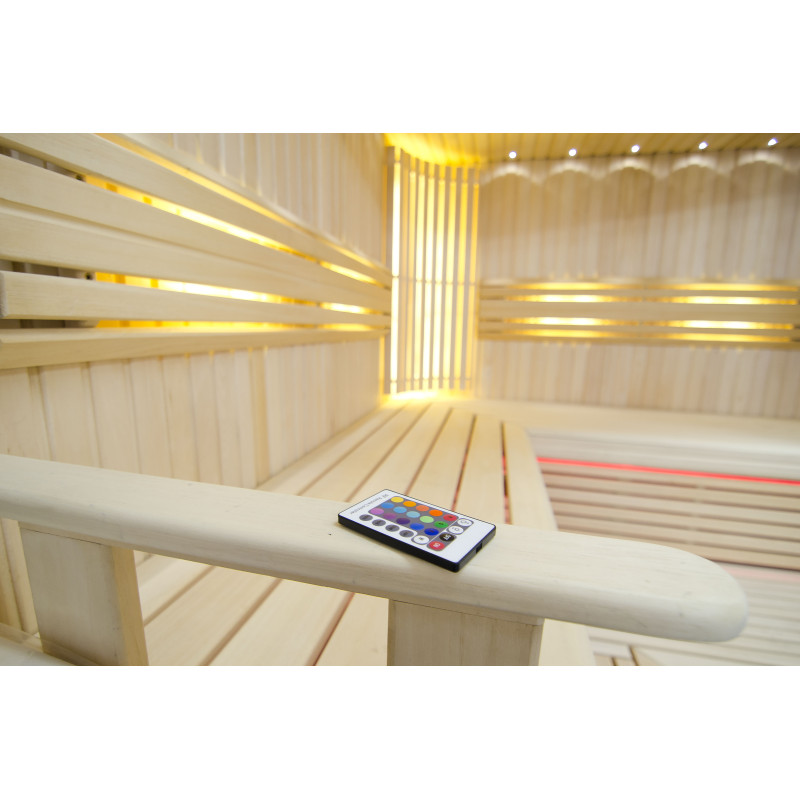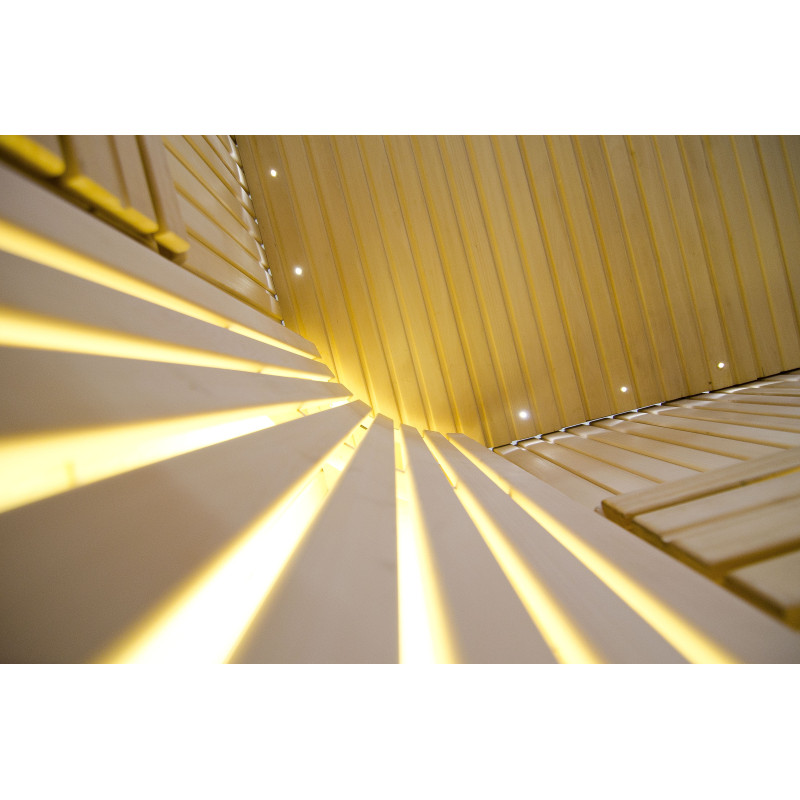 Il soffitto è illuminato con illuminazione a LED bianchi "luna" - una buona alternativa all'illuminazione in fibra ottica. Sulle pareti sotto gli schienali - illuminazione calda a LED bianca, che accentua perfettamente la trama del legno. Sotto le panche - Illuminazione a colori LED RGB, i cui colori si possono facilmente controllare con il telecomando per creare l'atmosfera desiderata della sauna.