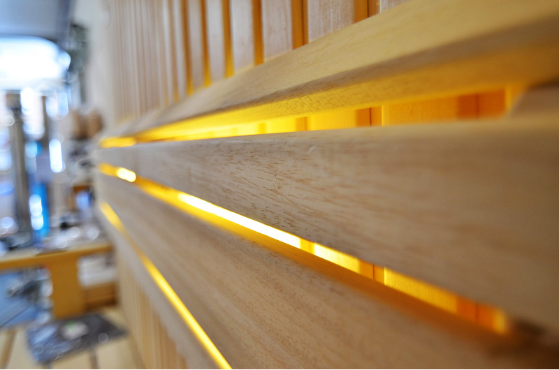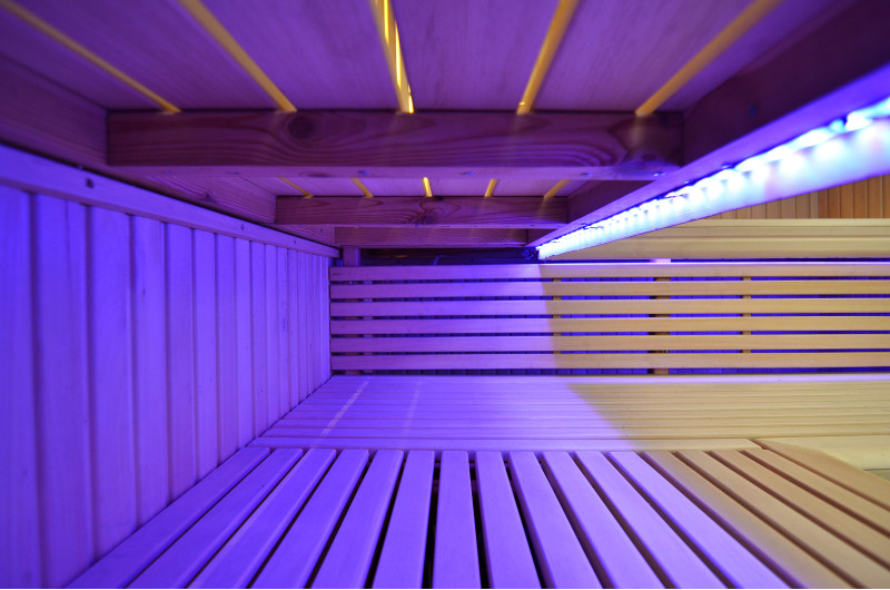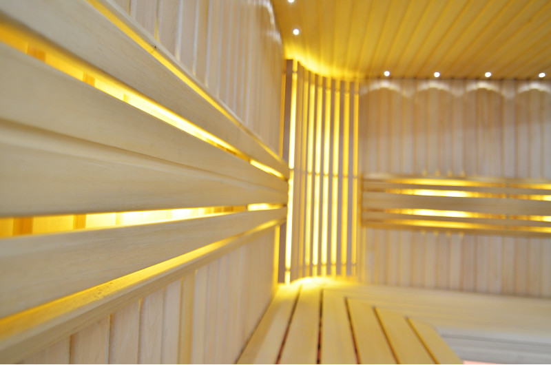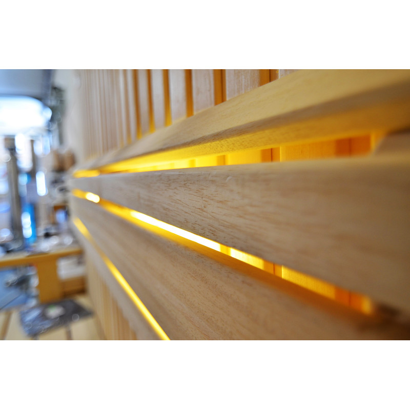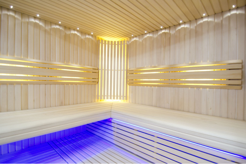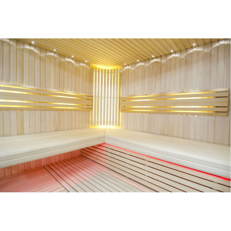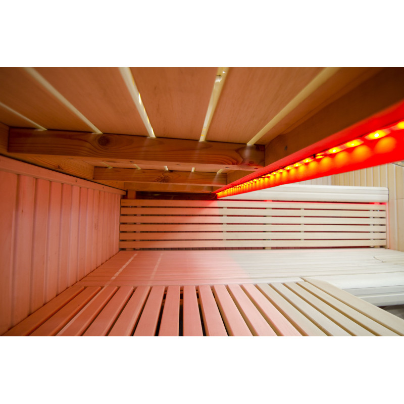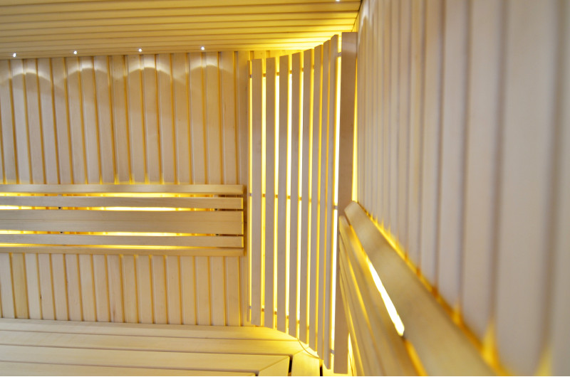 Il soffitto è illuminato con illuminazione a LED bianchi "luna" - una buona alternativa all'illuminazione in fibra ottica. Sulle pareti sotto gli schienali - illuminazione calda a LED bianca, che accentua perfettamente la trama del legno. Sotto le panche - Illuminazione a colori LED RGB, i cui colori si possono facilmente controllare con il telecomando per creare l'atmosfera desiderata della sauna.