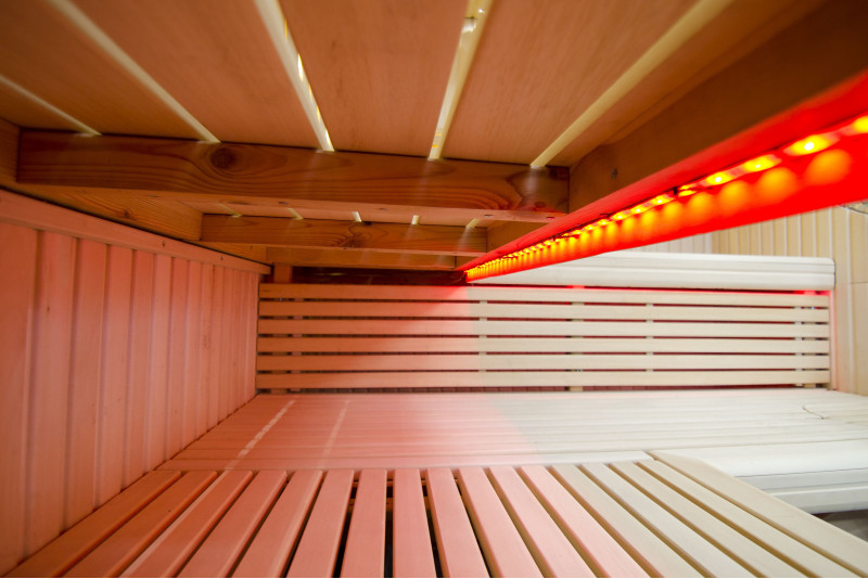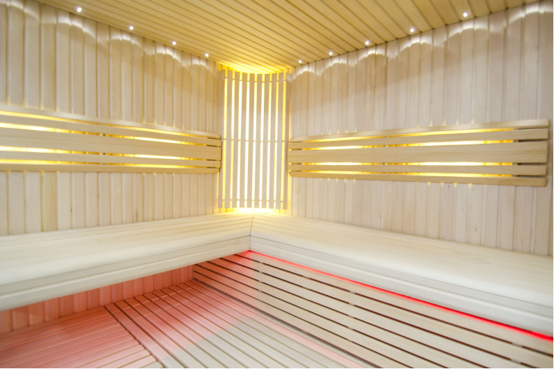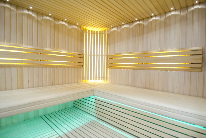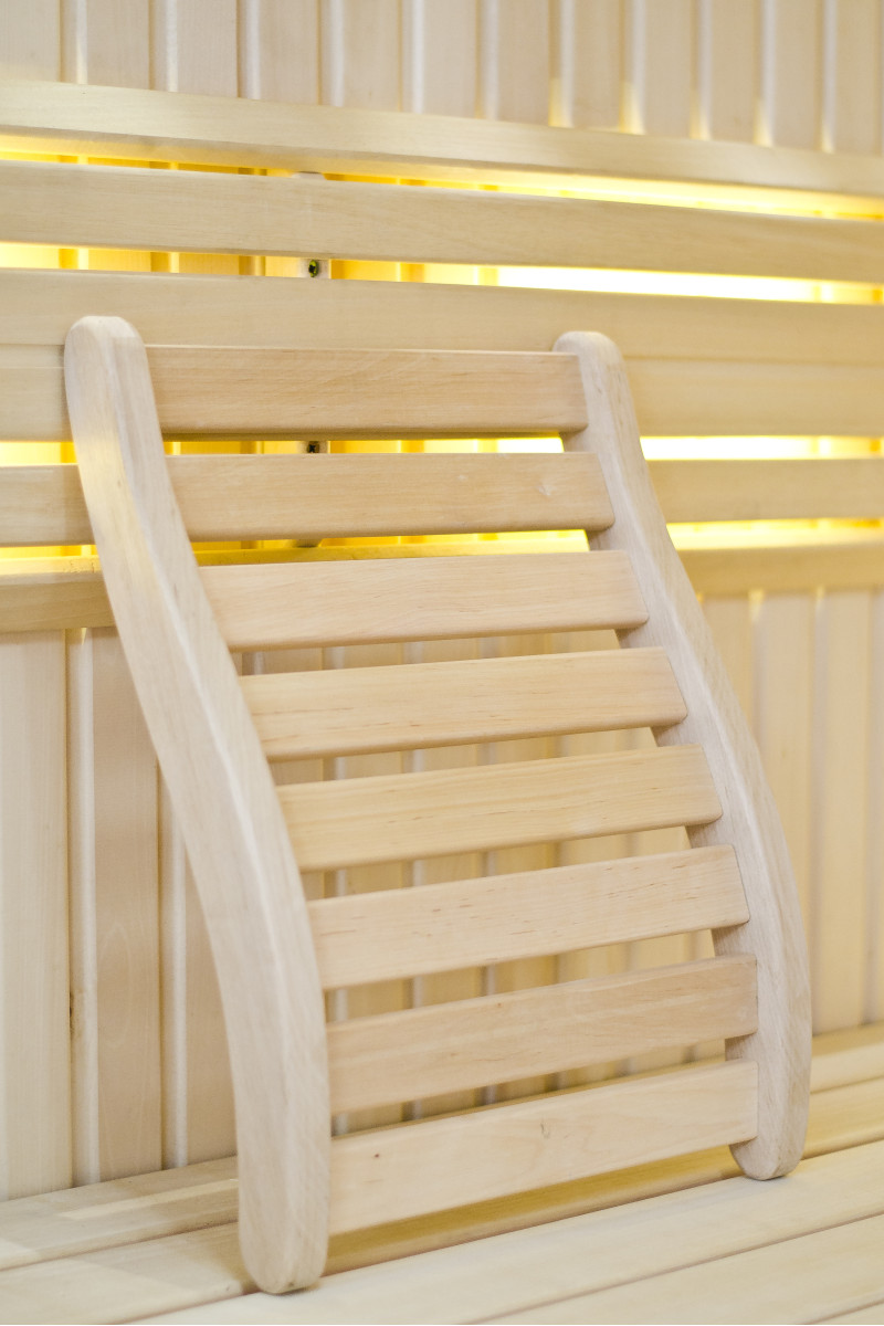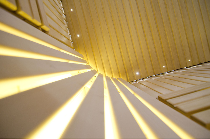 Le pareti sono realizzate in legno di tiglio chiaro di altissima qualità, mentre le panche e gli schienali sono in legno di abachi africano, che non si riscalda molto, rendendo particolarmente piacevole e comoda la seduta.