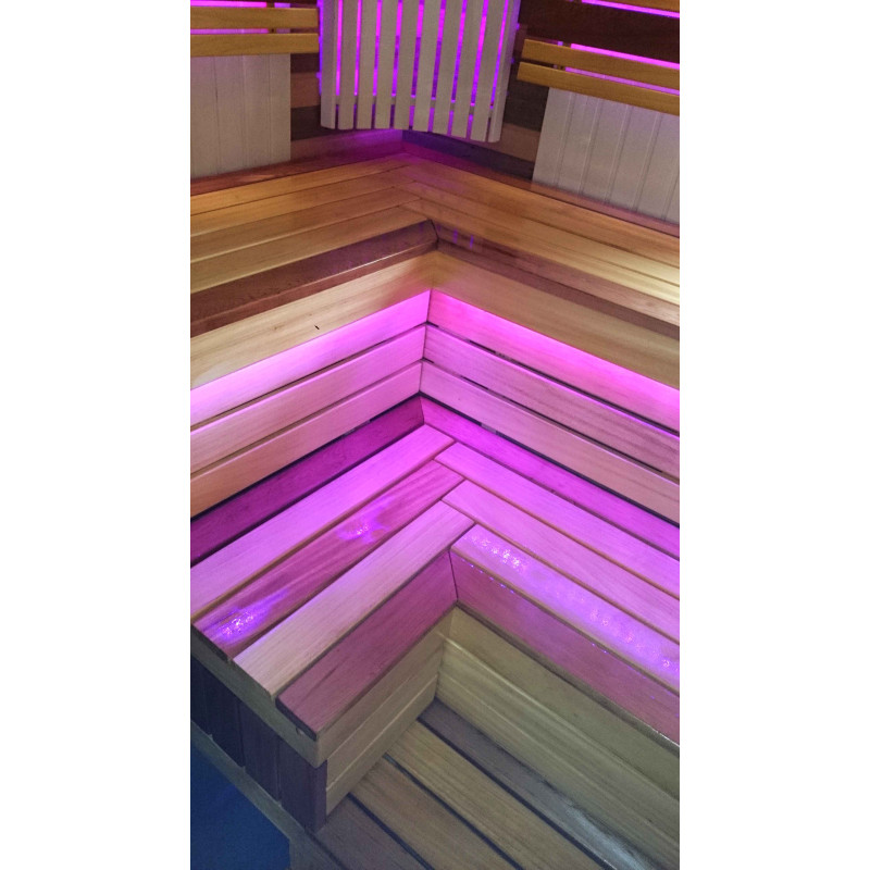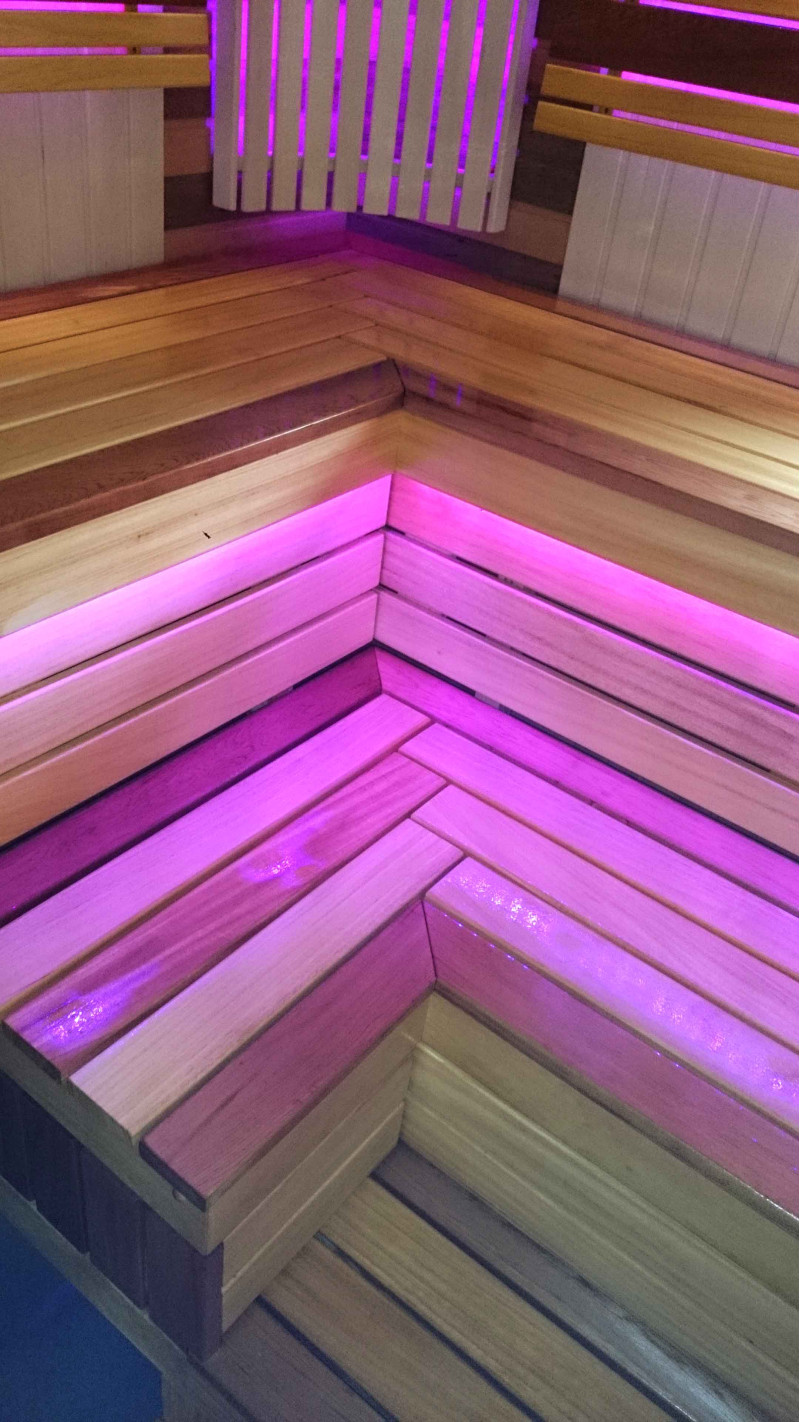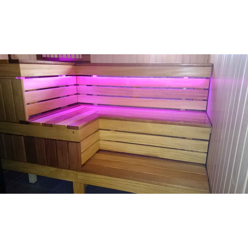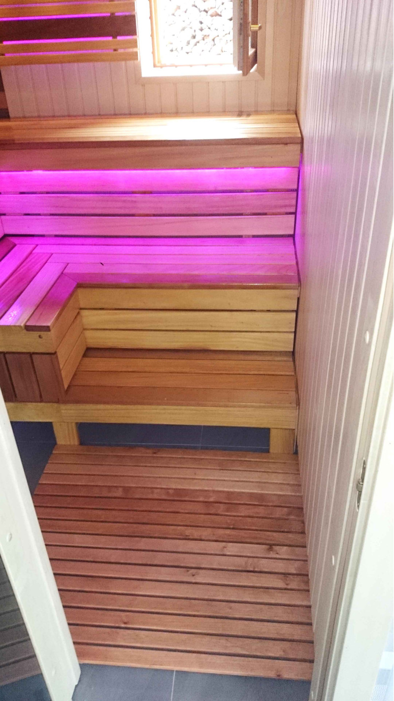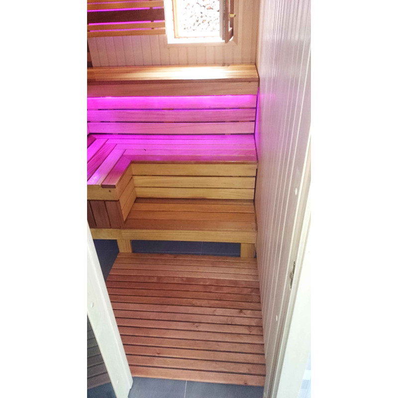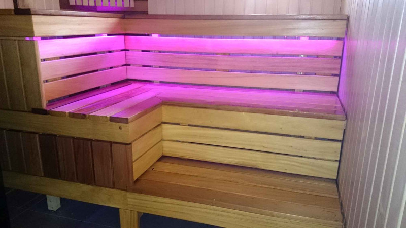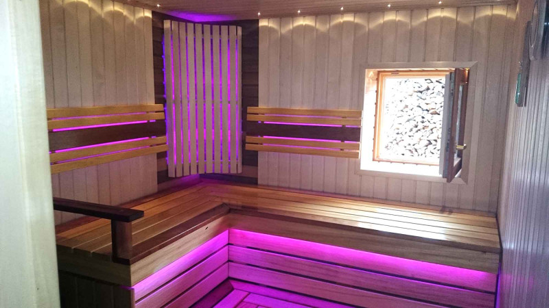La sauna è dotata di un sistema di ventilazione. L'illuminazione colorata è installata sotto le panche e dietro gli schienali, creando un ambiente accogliente e rilassante. Lampada a sospensione Harvia con copertura in legno di abachi. Termometro e igrometro Harvia, due scale.