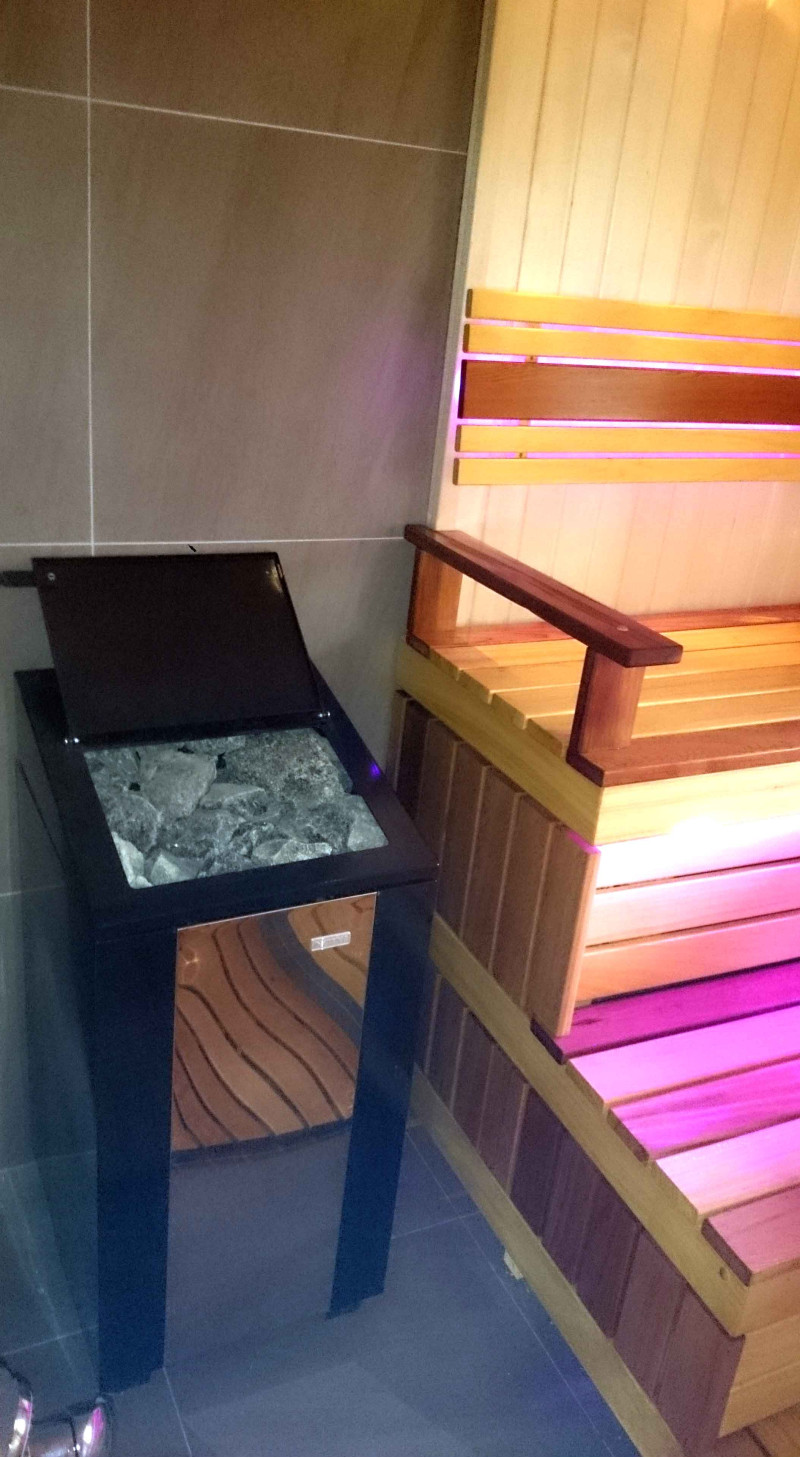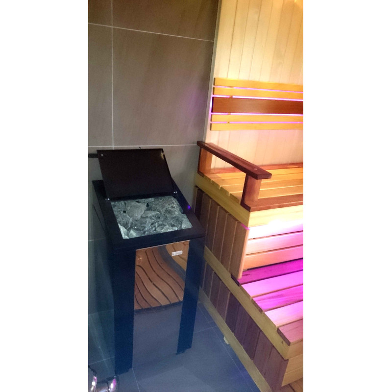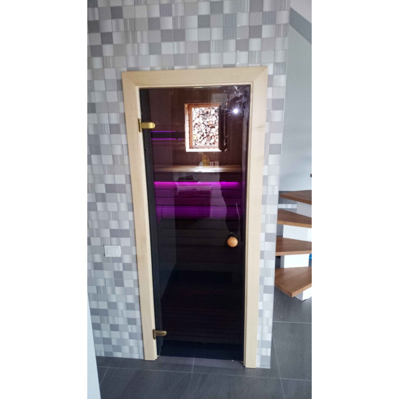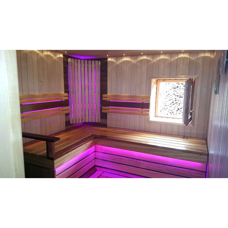 Le panche della sauna e il poggiapolsi-paralume sono realizzati con tavole di legno di abachi africano. Questo legno di alta qualità riscalda meno di tutti, quindi è bello toccarlo nella sauna. Pareti e soffitti sono realizzati con pannelli in legno di pino. La finestra della sauna sostiene il flusso della luce naturale, amplia lo spazio e crea un legame con la natura. Vetro della finestra - vetro temperato, resistente al calore, bronzo.