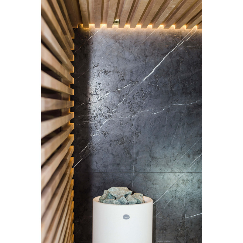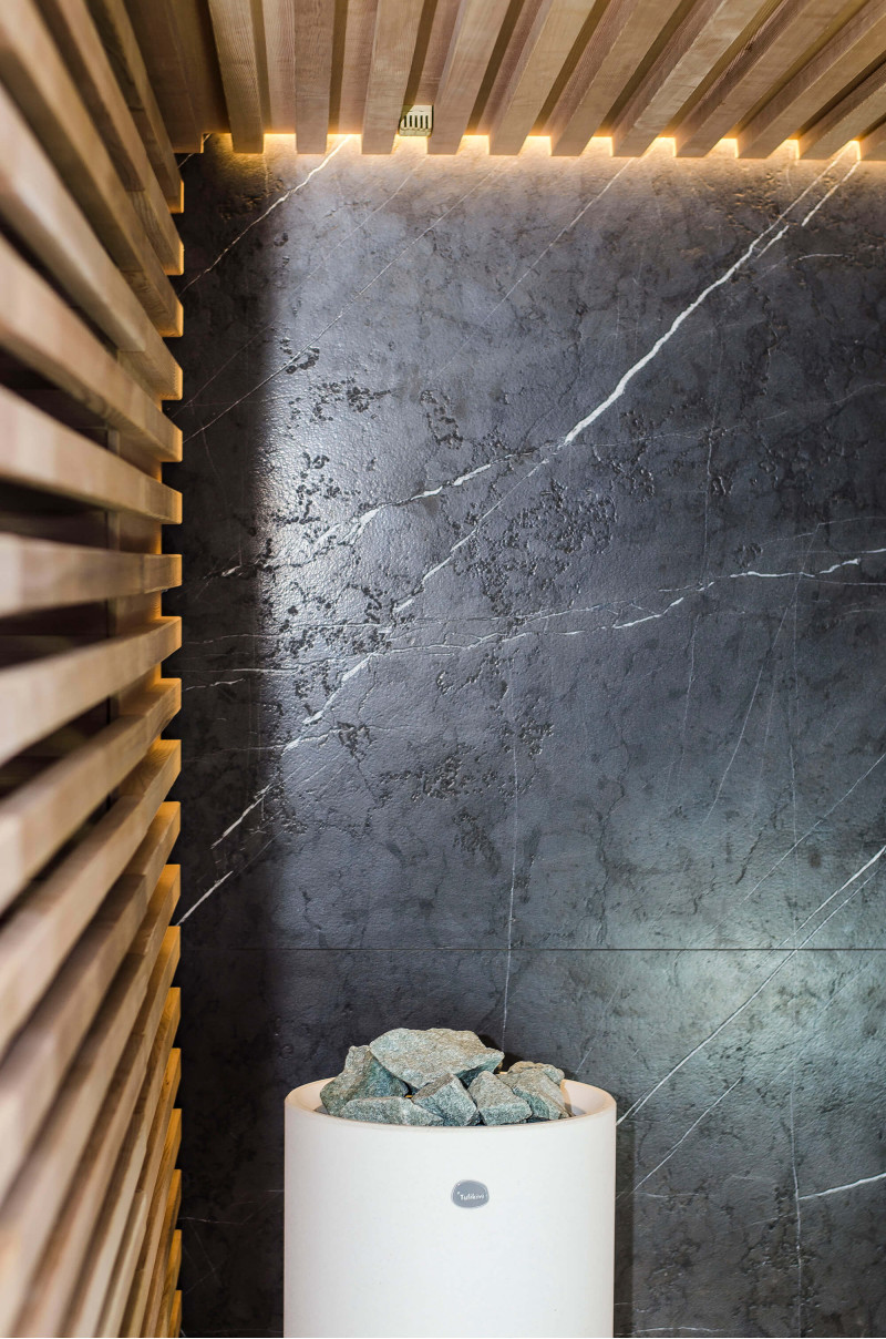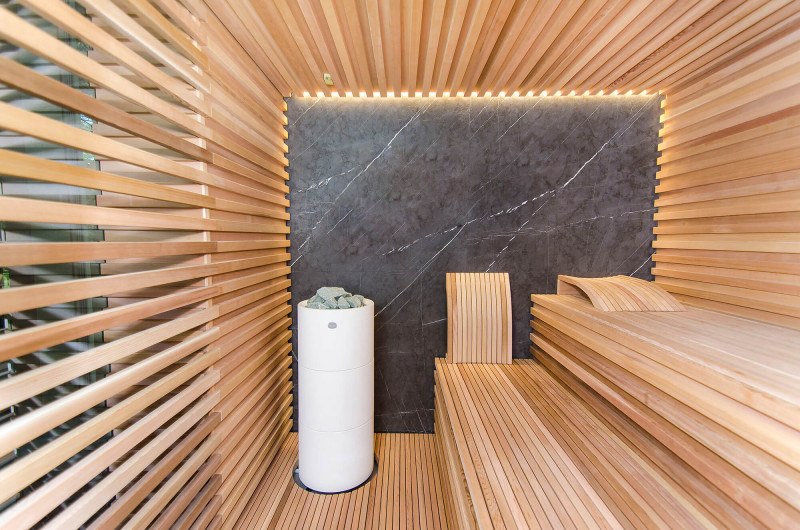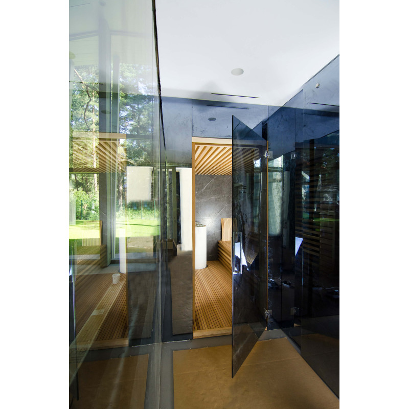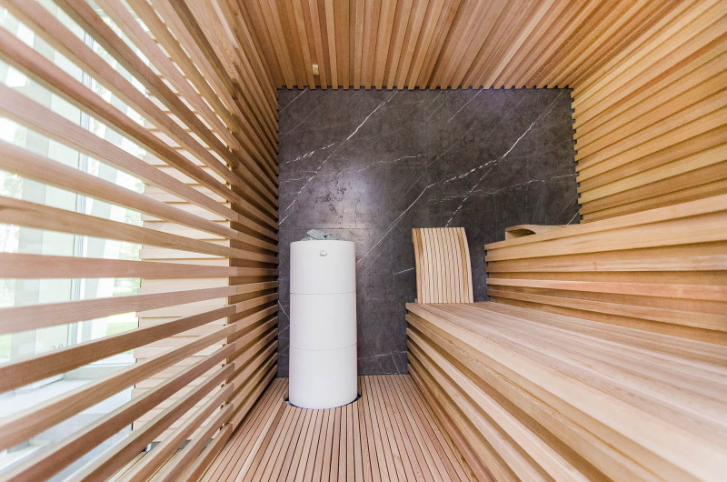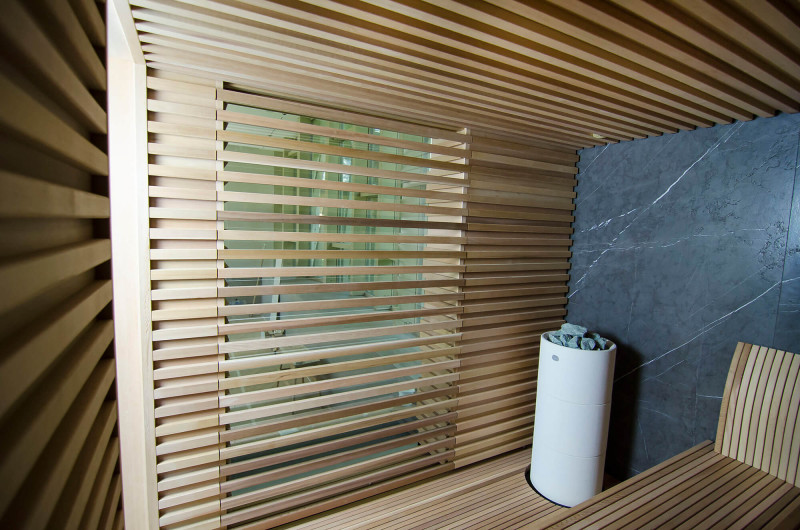 La decorazione della parete posteriore della sauna è in marmo italiano dal design esclusivo, la cui bellezza è enfatizzata dall'illuminazione a LED installata intorno ad essa. La decorazione della parete laterale della sauna è una vetrina in vetro, che è coperta da una griglia traforata rimovibile. La sauna si affaccia sull'area benessere, un'ampia zona piscina. L'illuminazione delle pareti e del soffitto della sauna è una striscia LED ermetica di colore bianco caldo. Porte in vetro senza telaio.