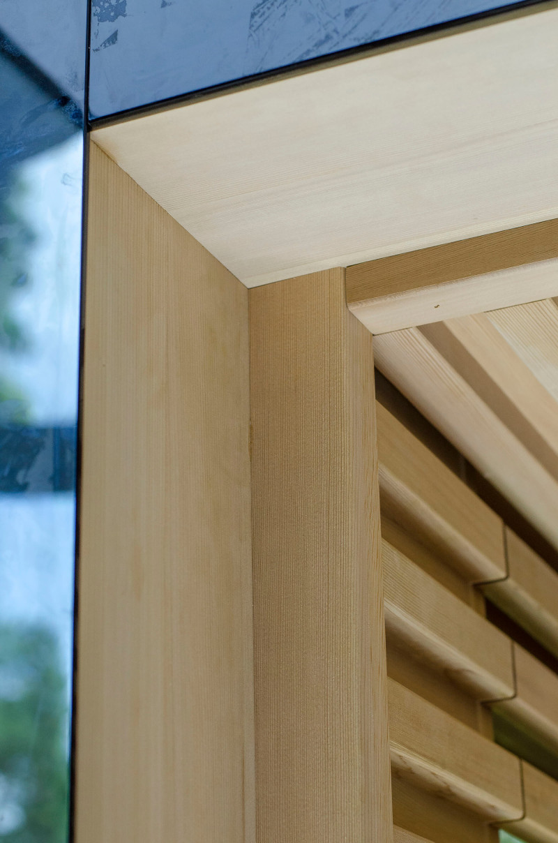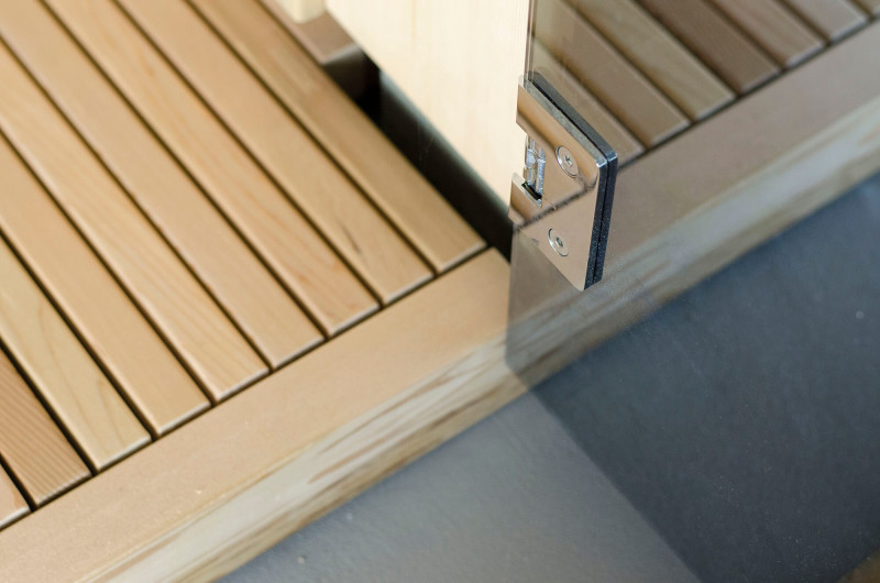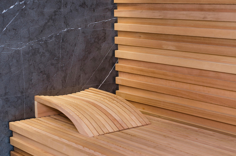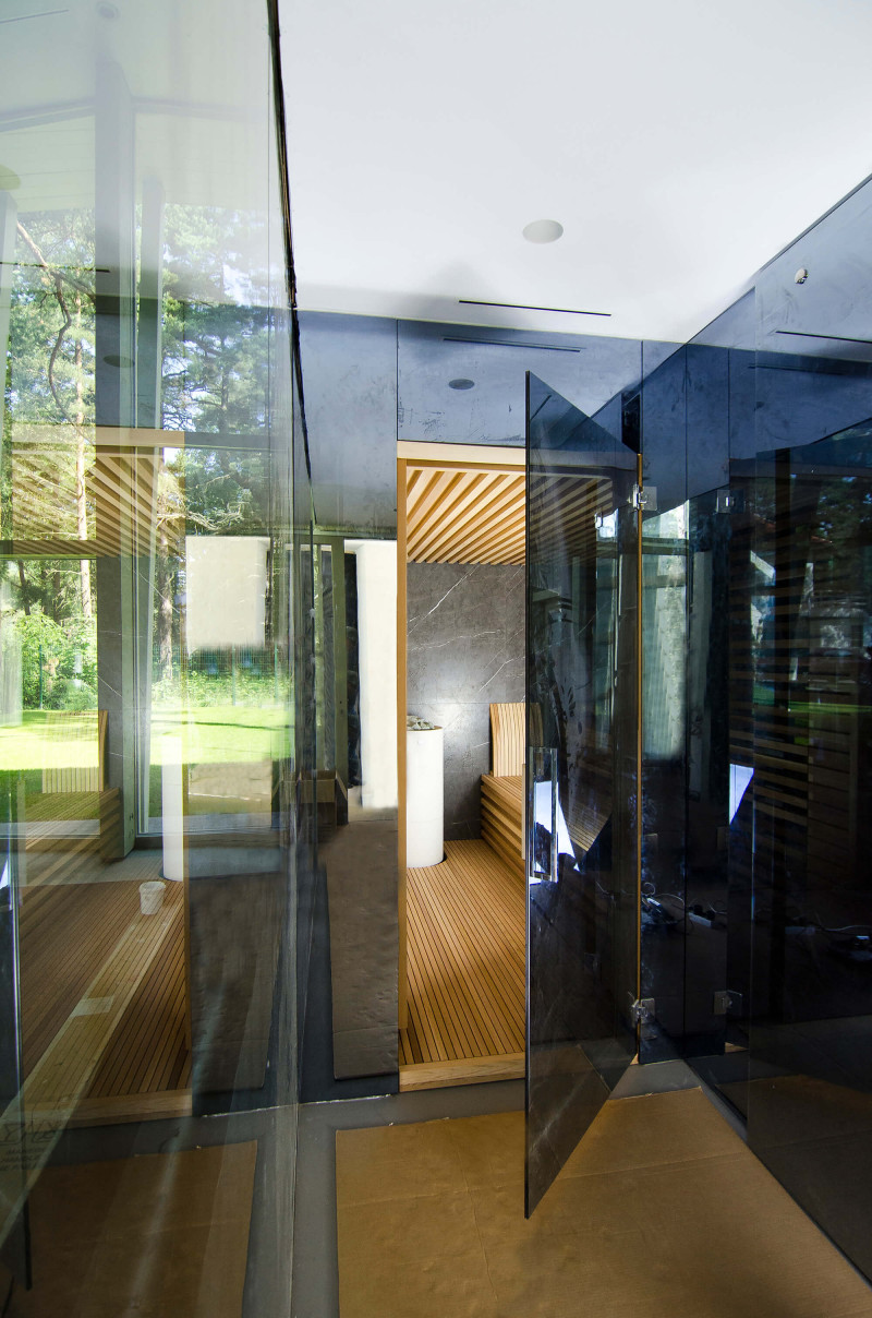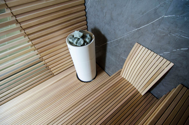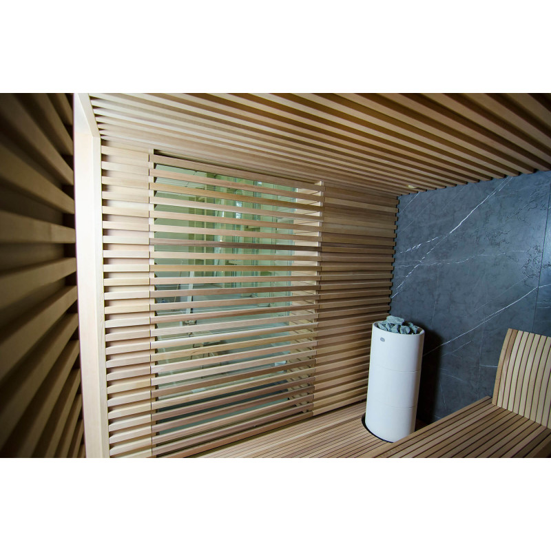 La decorazione della parete posteriore della sauna è in marmo italiano dal design esclusivo, la cui bellezza è enfatizzata dall'illuminazione a LED installata intorno ad essa. La decorazione della parete laterale della sauna è una vetrina in vetro, che è coperta da una griglia traforata rimovibile. La sauna si affaccia sull'area benessere, un'ampia zona piscina. L'illuminazione delle pareti e del soffitto della sauna è una striscia LED ermetica di colore bianco caldo. Porte in vetro senza telaio.
