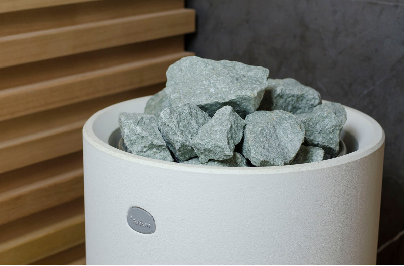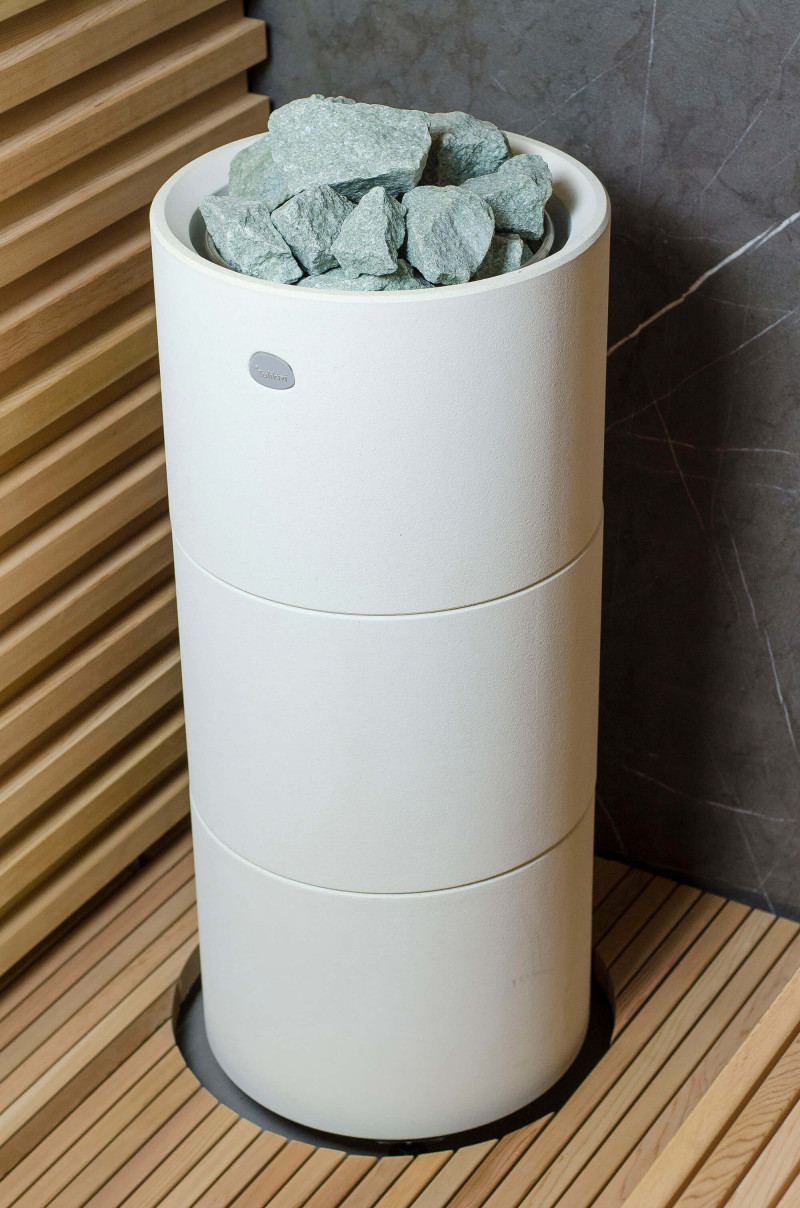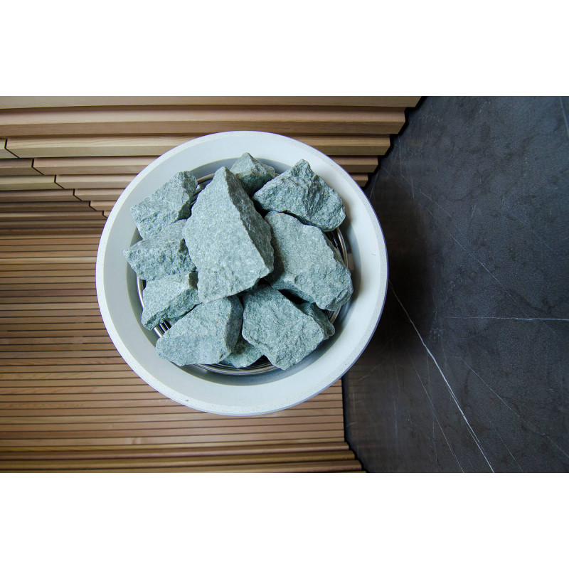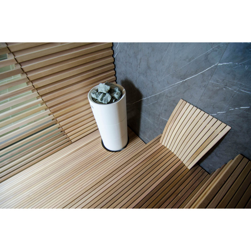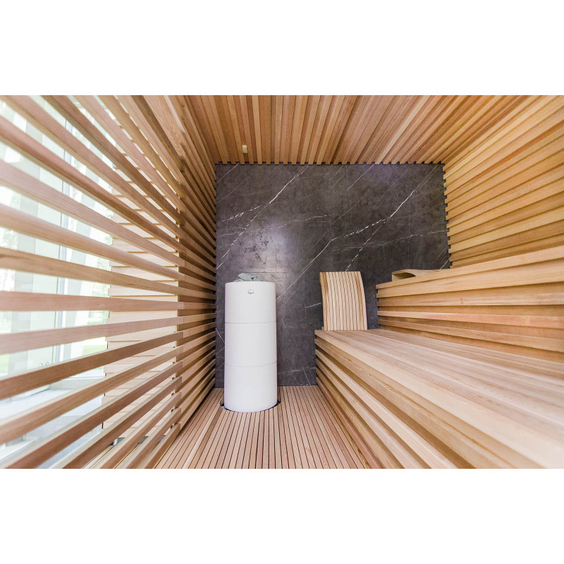 La fonte di calore è la stufa Tulikivi Kuura White, riempita con pietre di giadeite. Quando le pietre di giadeite vengono riscaldate, le sue proprietà curative vengono migliorate. Versare sulle pietre l'acqua della sauna diffonde un gradevole profumo di ambiente pulito, facilitando la respirazione. Un tubo di vapore è stato introdotto nel riscaldatore dal generatore di vapore della sauna a vapore, che consente di ottenere un'umidità molto più elevata nella stanza della sauna. Questa è un'ottima scelta se non hai le condizioni per installare un bagno turco e una sauna. Un sistema di controllo comune è un grande monitor LED fisso. Tutte le apparecchiature sono inoltre controllate da un dispositivo intelligente da qualsiasi parte del mondo.