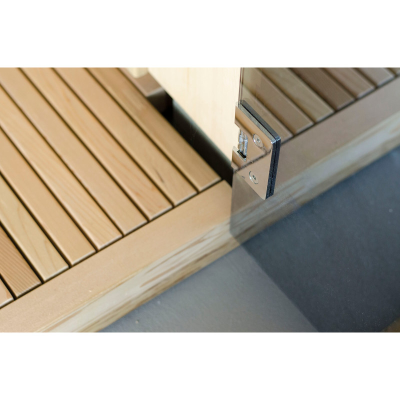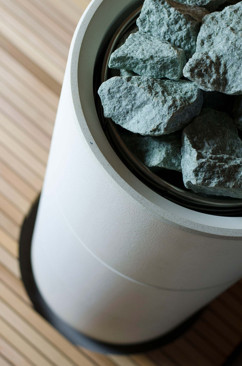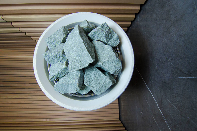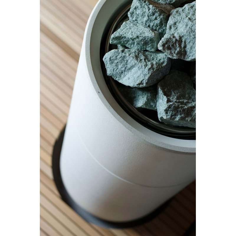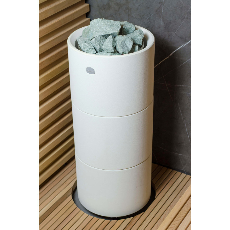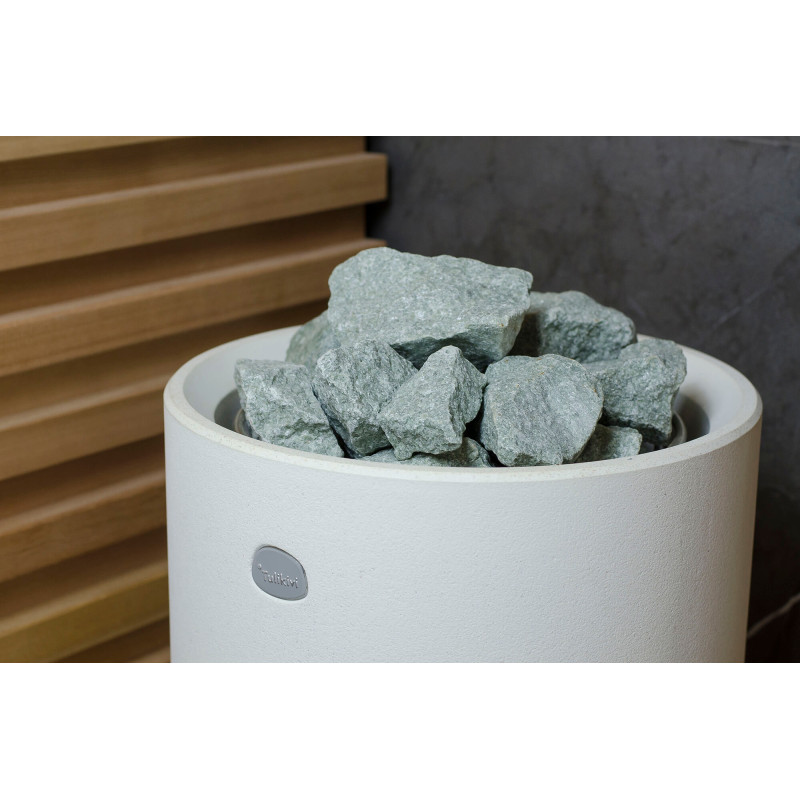 La fonte di calore è la stufa Tulikivi Kuura White, riempita con pietre di giadeite. Quando le pietre di giadeite vengono riscaldate, le sue proprietà curative vengono migliorate. Versare sulle pietre l'acqua della sauna diffonde un gradevole profumo di ambiente pulito, facilitando la respirazione. Un tubo di vapore è stato introdotto nel riscaldatore dal generatore di vapore della sauna a vapore, che consente di ottenere un'umidità molto più elevata nella stanza della sauna. Questa è un'ottima scelta se non hai le condizioni per installare un bagno turco e una sauna. Un sistema di controllo comune è un grande monitor LED fisso. Tutte le apparecchiature sono inoltre controllate da un dispositivo intelligente da qualsiasi parte del mondo.
