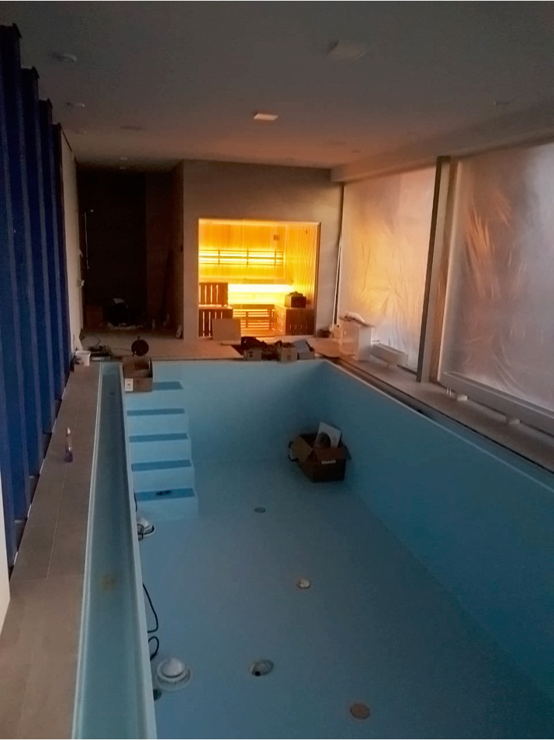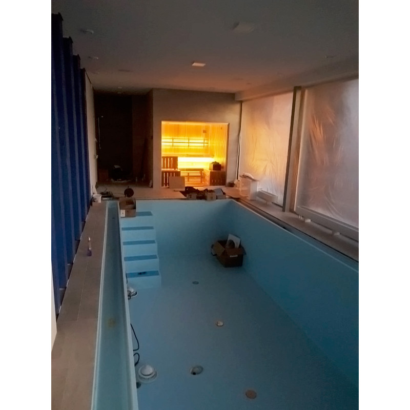 Installazione di una vetrina - vetro temperato fumé 8 mm in un telaio di alluminio. Grazie alla vetrina in vetro si apre la vista sulla zona piscina, si ingrandisce il piccolo locale sauna e si dà più luce alla sauna.