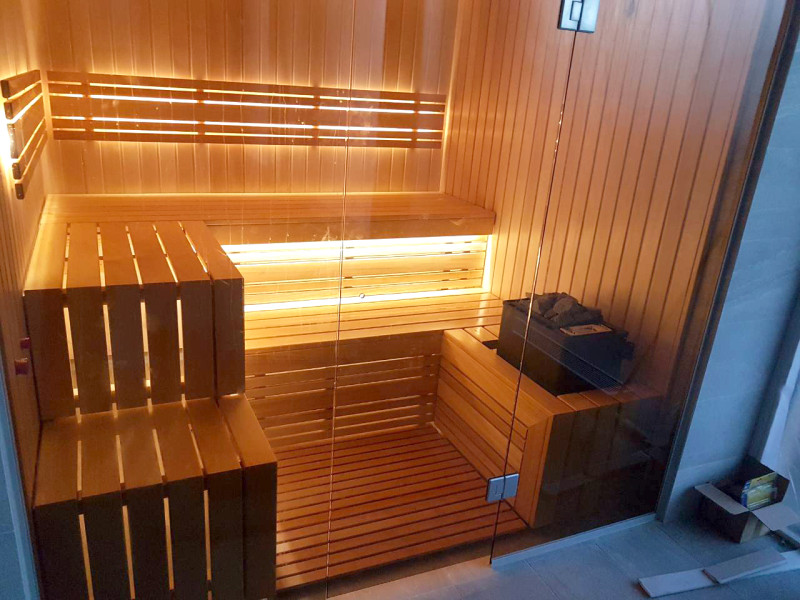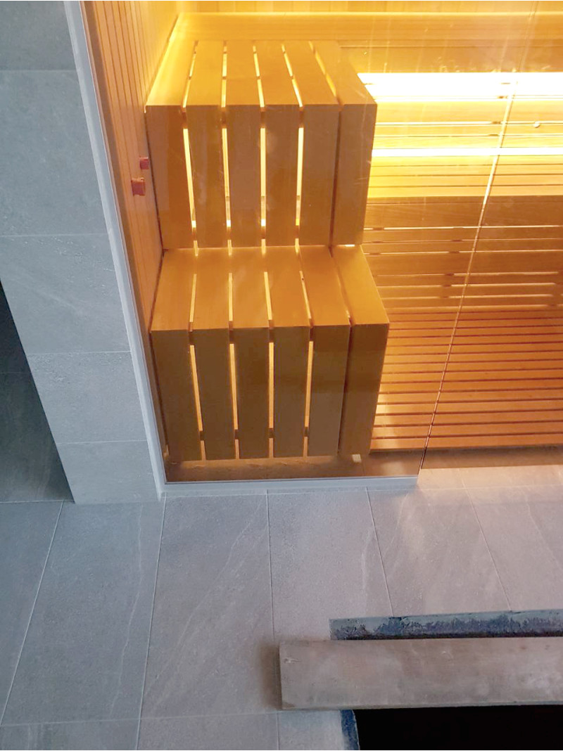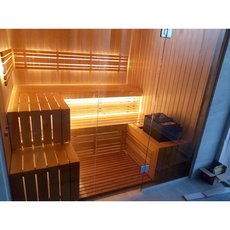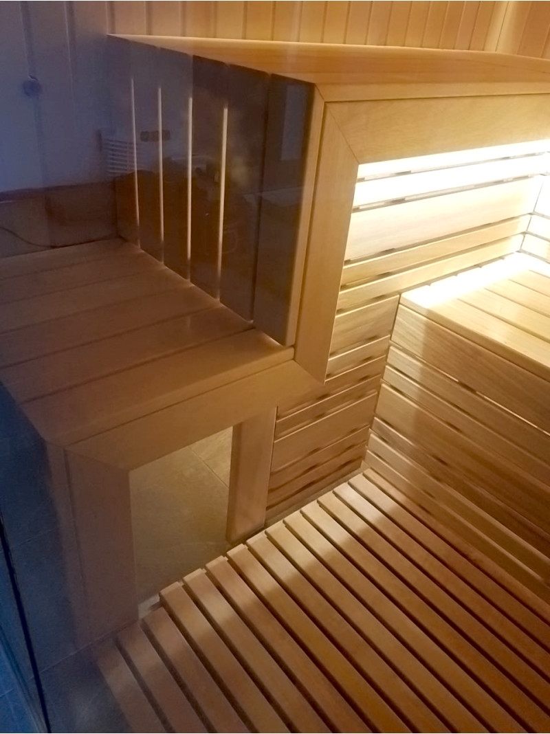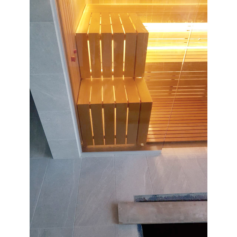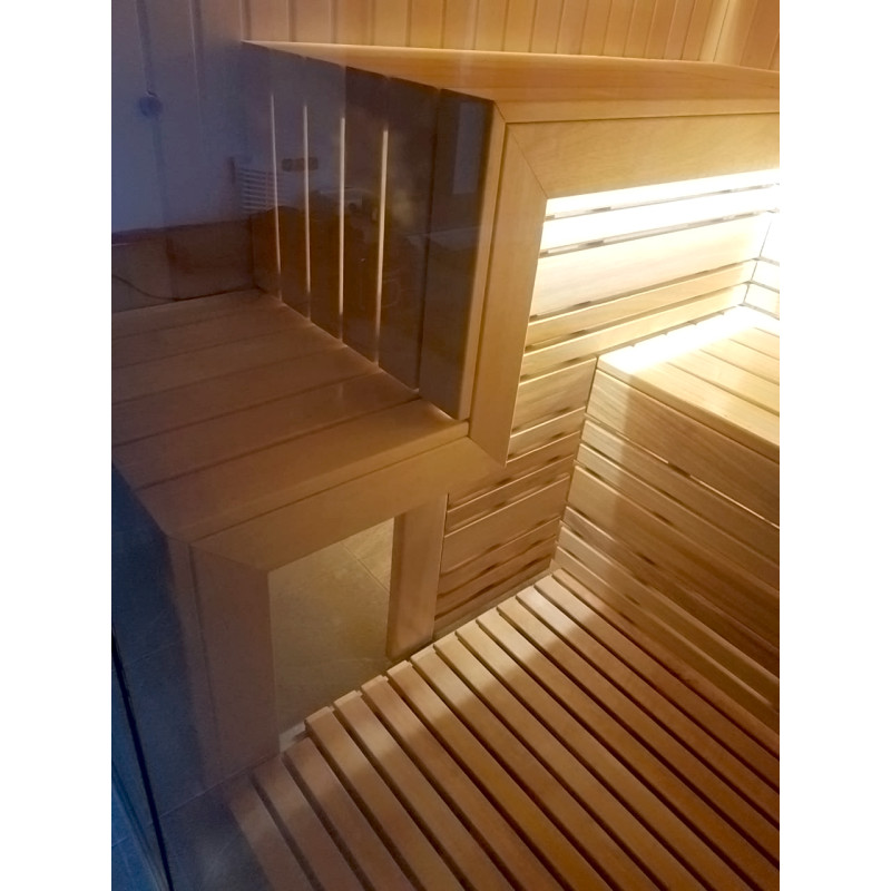 Il legno di abachi per panche e schienali è un'ottima scelta, poiché questo legno di qualità non si surriscalda ed è impossibile scottarsi quando si è seduti su panche fatte di tale legno. Il legno di cedro conferisce un aspetto moderno anche all'interno della sauna.